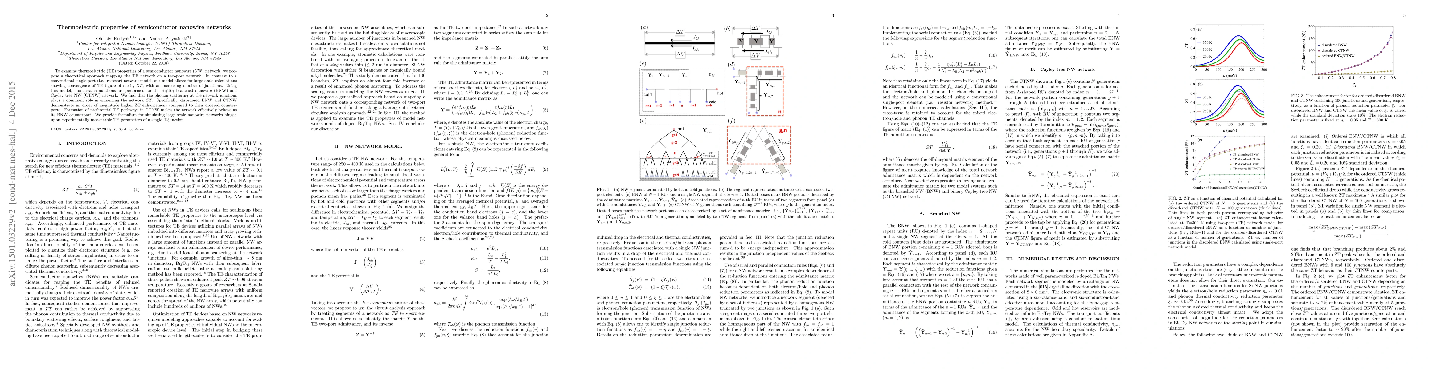 To examine thermoelectric (TE) properties of a semiconductor nanowire (NW) network, we propose a theoretical approach mapping the TE network on a two-port network. In contrast to a conventional single-port (i.e., resistor) network model, our model allows for large scale calculations showing convergence of TE figure of merit, $ZT$, with an increasing number of junctions. Using this model, numerical simulations are performed for the Bi$_2$Te$_3$ branched nanowire (BNW) and Cayley tree NW (CTNW) network. We find that the phonon scattering at the network junctions plays a dominant role in enhancing the network $ZT$. Specifically, disordered BNW and CTNW demonstrate an order of magnitude higher ZT enhancement compared to their ordered counterparts. Formation of preferential TE pathways in CTNW makes the network effectively behave as its BNW counterpart. We provide formalism for simulating large scale nanowire networks hinged upon experimentally measurable TE parameters of a single T-junction.