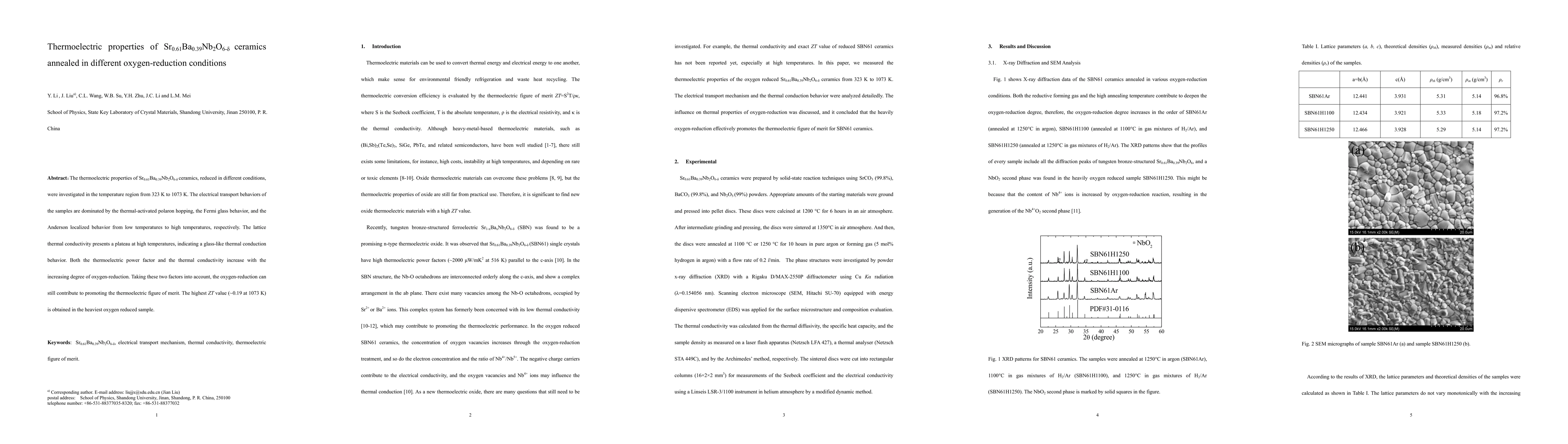 This study investigates the thermoelectric properties of Sr0.61Ba0.39Nb2O6 ceramics annealed under various oxygen-reduction conditions, finding that increased oxygen-reduction enhances both thermoelectric power factor and thermal conductivity, leading to a highest ZT value of ~0.19 at 1073 K.