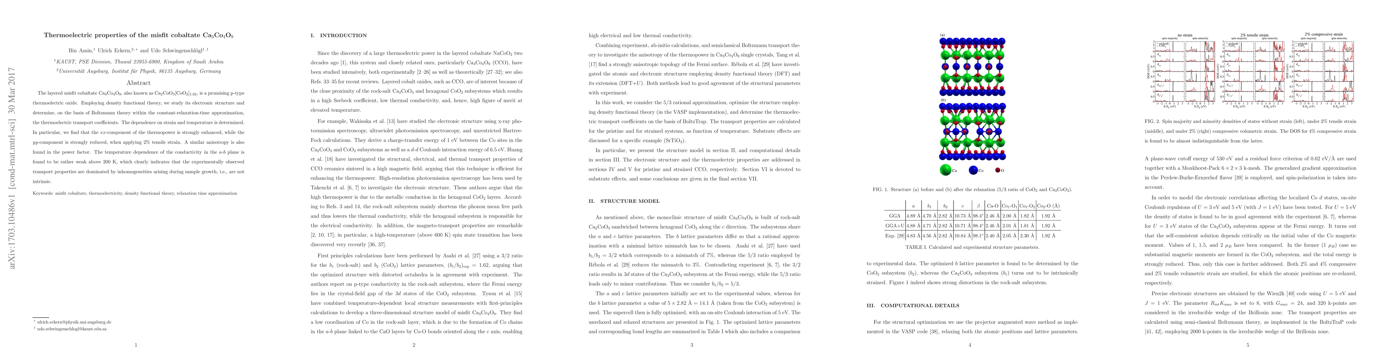 This paper investigates the thermoelectric properties of the misfit cobaltate Ca$_3$Co$_4$O$_9$ using density functional theory and Boltzmann transport theory. It finds that applying 2% tensile strain significantly enhances the $xx$-component of thermopower while reducing the $yy$-component, indicating anisotropic thermoelectric transport; however, the temperature dependence of conductivity is weak above 200 K, suggesting observed transport properties are dominated by sample growth inhomogeneities rather than intrinsic material properties.