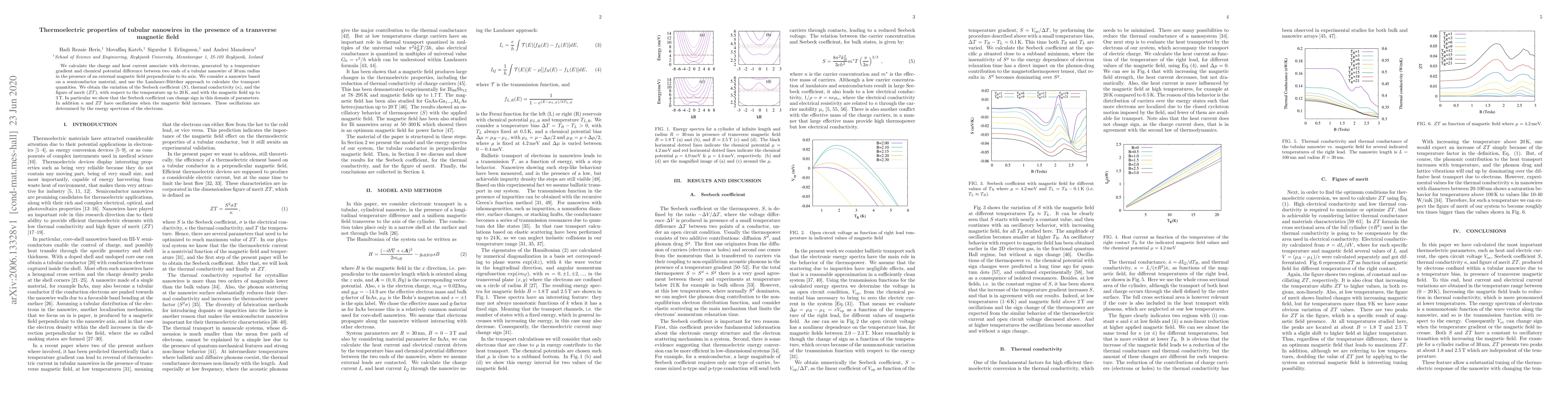 Researchers studied thermoelectric properties of tubular nanowires under a magnetic field, finding that the Seebeck coefficient can change sign and experiencing oscillations in thermal conductivity and figure of merit with increasing magnetic field.