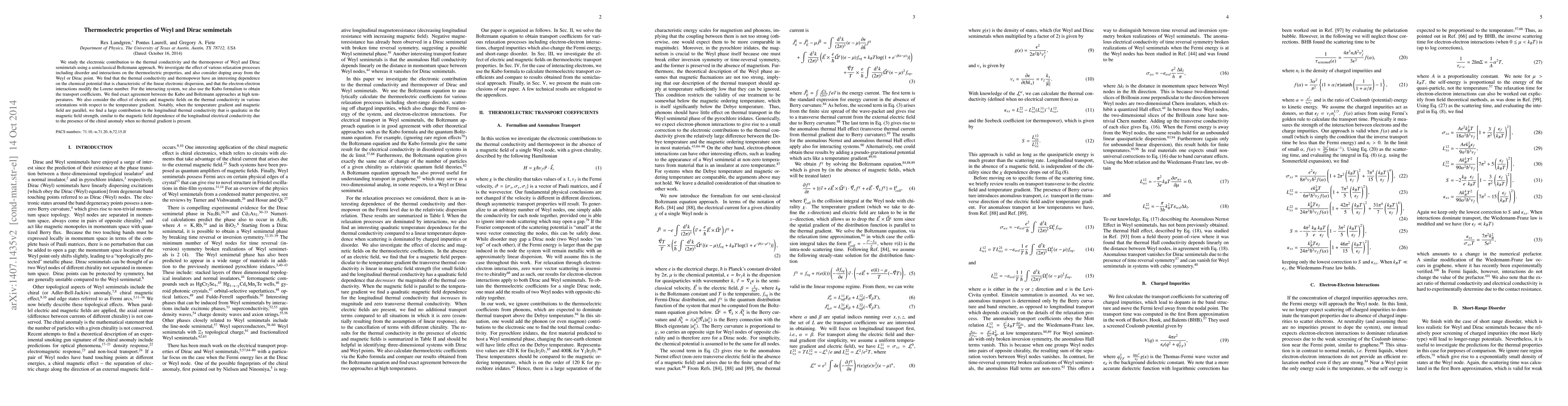 This paper examines thermoelectric properties of Weyl and Dirac semimetals using a Boltzmann approach, finding significant dependencies on chemical potential due to linear electronic dispersion. It also reveals modifications to the Lorenz number by electron-electron interactions and a notable enhancement in longitudinal thermal conductivity when magnetic fields align with temperature gradients, mirroring electrical conductivity behavior due to the chiral anomaly.