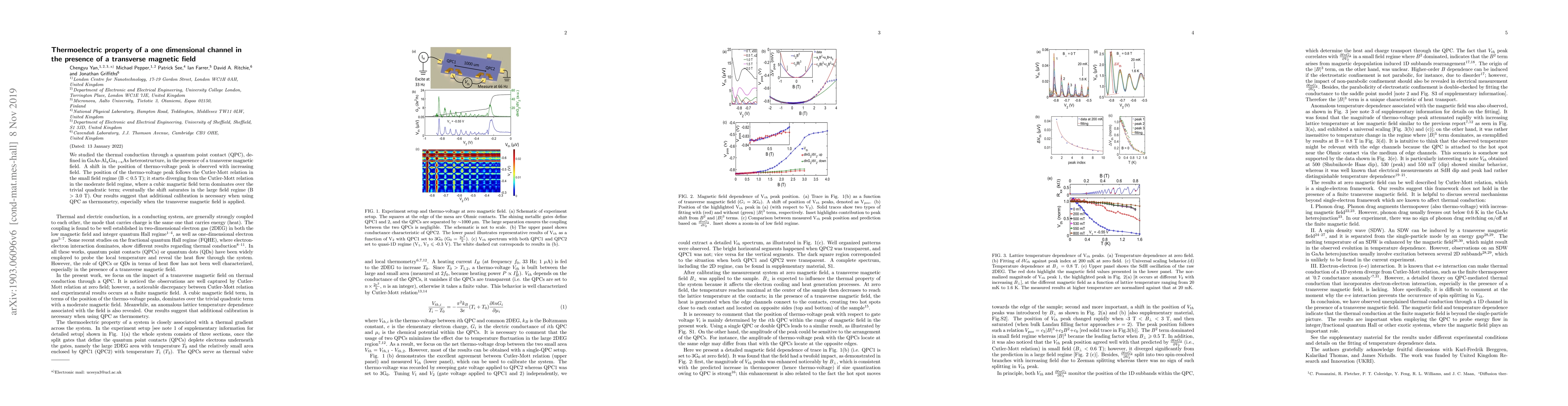 We studied the thermal conduction through a quantum point contact (QPC), defined in GaAs-AlGaAs heterostructure, in the presence of a transverse magnetic field. A shift in the position of thermo-voltage peak is observed with increasing field. The position of the thermo-voltage peak follows the Cutler-Mott relation in the small field regime (B < 0.5 T); it starts diverging from the Cutler-Mott relation in the moderate field regime, where a cubic magnetic field term dominates over the trivial quadratic term; eventually the shift saturates in the large field regime (B > 3.0 T). Our results suggest that additional calibration is necessary when using QPC as thermometry, especially when the transverse magnetic field is applied.