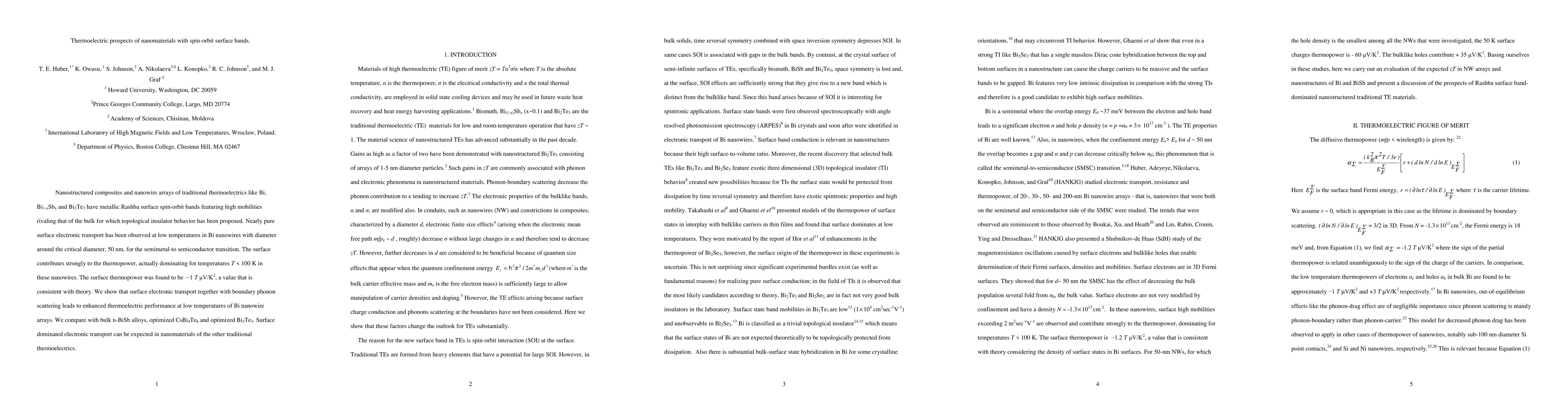 Nanostructured composites and nanowire arrays of traditional thermoelectrics like Bi, Bi(1-x)Sb(x) and Bi(2)Te(3) have metallic Rashba surface spin-orbit bands featuring high mobilities rivaling that of the bulk for which topological insulator behavior has been proposed. Nearly pure surface electronic transport has been observed at low temperatures in Bi nanowires with diameter around the critical diameter, 50 nm, for the semimetal-to semiconductor transition. The surface contributes strongly to the thermopower, actually dominating for temperatures T < 100 K in these nanowires. The surface thermopower was found to be -1 T microvolt/(K^2), a value that is consistent with theory. We show that surface electronic transport together with boundary phonon scattering leads to enhanced thermoelectric performance at low temperatures of Bi nanowire arrays. We compare with bulk n-BiSb alloys, optimized CsBi(4)Te(6) and optimized Bi(2)Te(3). Surface dominated electronic transport can be expected in nanomaterials of the other traditional thermoelectrics.