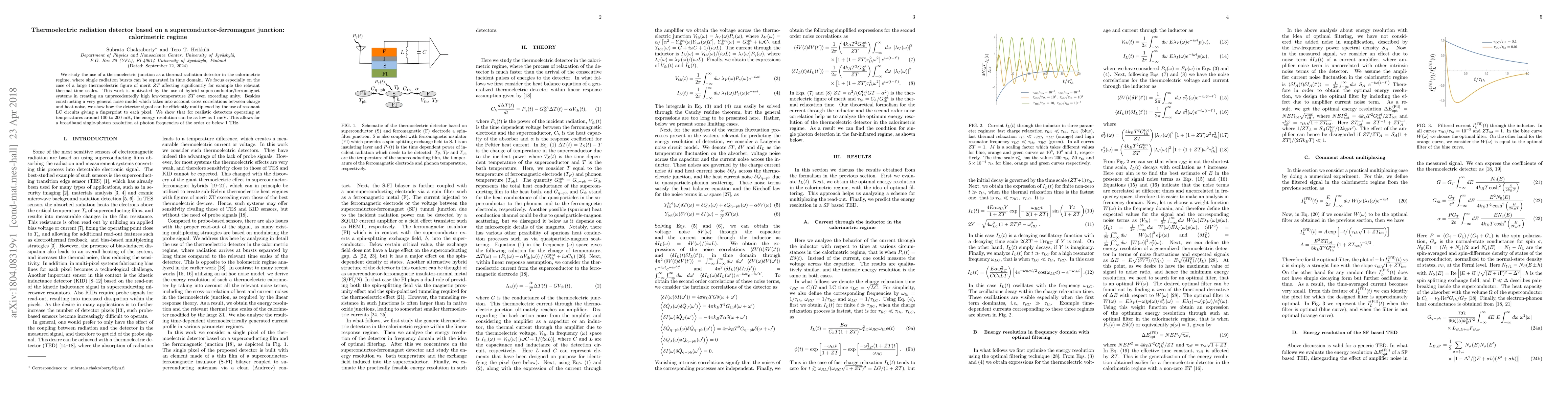 This paper investigates a thermoelectric radiation detector based on a superconductor-ferromagnet junction operating in the calorimetric regime, highlighting the potential of high thermoelectric figure of merit $ZT$ materials. The study proposes efficient multiplexing using resonant LC circuits and demonstrates an energy resolution of 1 meV at temperatures around 100-200 mK, enabling single-photon detection at frequencies below 1 THz.