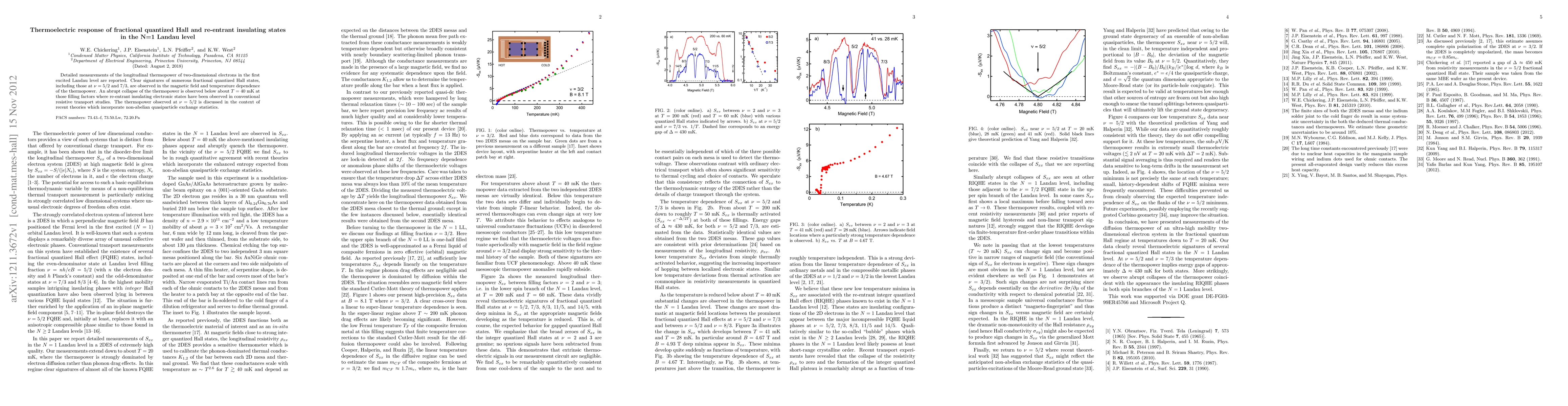 This paper reports detailed measurements of thermopower in two-dimensional electrons at the N=1 Landau level, revealing clear signatures of fractional quantized Hall states, including $\nu = 5/2$ and 7/3. An abrupt thermopower collapse occurs below 40 mK, coinciding with re-entrant insulating states, suggesting a link between thermopower and insulating behavior.