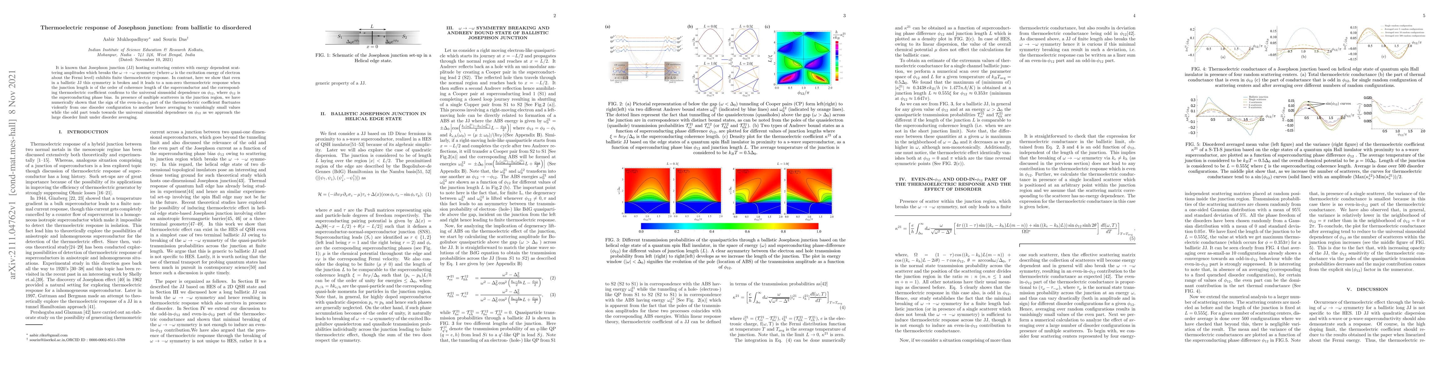 It is known that Josephson junction (JJ) hosting scattering centers with energy-dependent scattering amplitudes which breaks the $\omega\rightarrow-\omega$ symmetry (where $\omega$ is the excitation energy of electron about the Fermi level) exhibits finite thermoelectric response. In contrast, here we show that even in a ballistic JJ this symmetry is broken and it leads to a non-zero thermoelectric response when the junction length is of the order of coherence length of the superconductor and the corresponding thermoelectric coefficient confirms to the universal sinusoidal dependence on $\phi_{12}$, where $\phi_{12}$ is the superconducting phase bias. In presence of multiple scatterers in the junction region, we have numerically shown that the sign of the even-in-$\phi_{12}$ part of the thermoelectric coefficient fluctuates violently from one disorder configuration to another hence averaging to vanishingly small values while the odd part tends towards the universal sinusoidal dependence on $\phi_{12}$ as we approach the large disorder limit under disorder averaging.