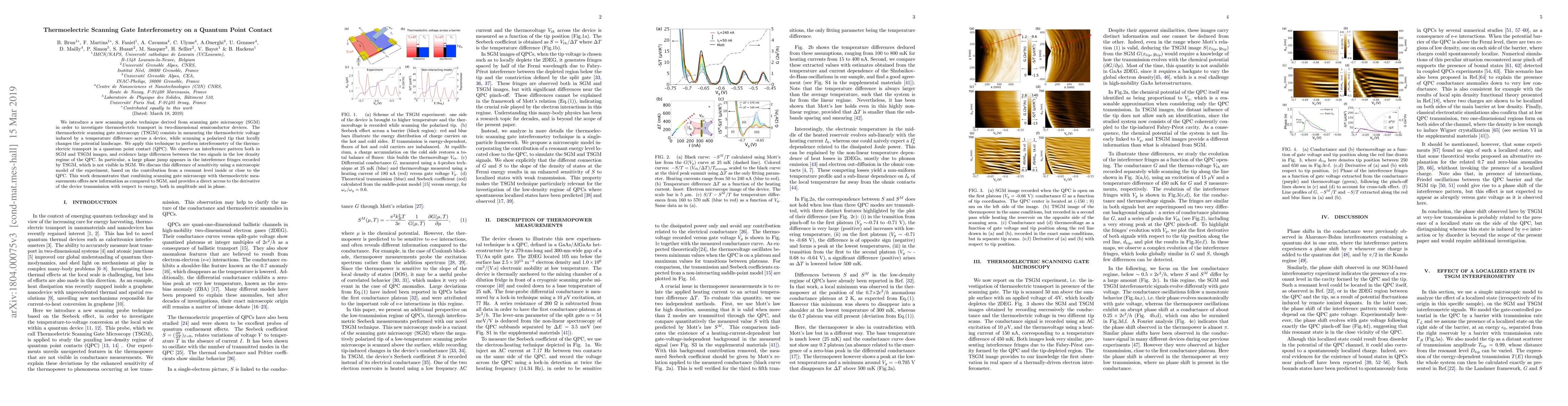 We introduce a new scanning probe technique derived from scanning gate microscopy (SGM) in order to investigate thermoelectric transport in two-dimensional semiconductor devices. The thermoelectric scanning gate Microscopy (TSGM) consists in measuring the thermoelectric voltage induced by a temperature difference across a device, while scanning a polarized tip that locally changes the potential landscape. We apply this technique to perform interferometry of the thermoelectric transport in a quantum point contact (QPC). We observe an interference pattern both in SGM and TSGM images, and evidence large differences between the two signals in the low density regime of the QPC. In particular, a large phase jump appears in the interference fringes recorded by TSGM, which is not visible in SGM. We discuss this difference of sensitivity using a microscopic model of the experiment, based on the contribution from a resonant level inside or close to the QPC. This work demonstrates that combining scanning gate microscopy with thermoelectric measurements offers new information as compared to SGM, and provides a direct access to the derivative of the device transmission with respect to energy, both in amplitude and in phase.