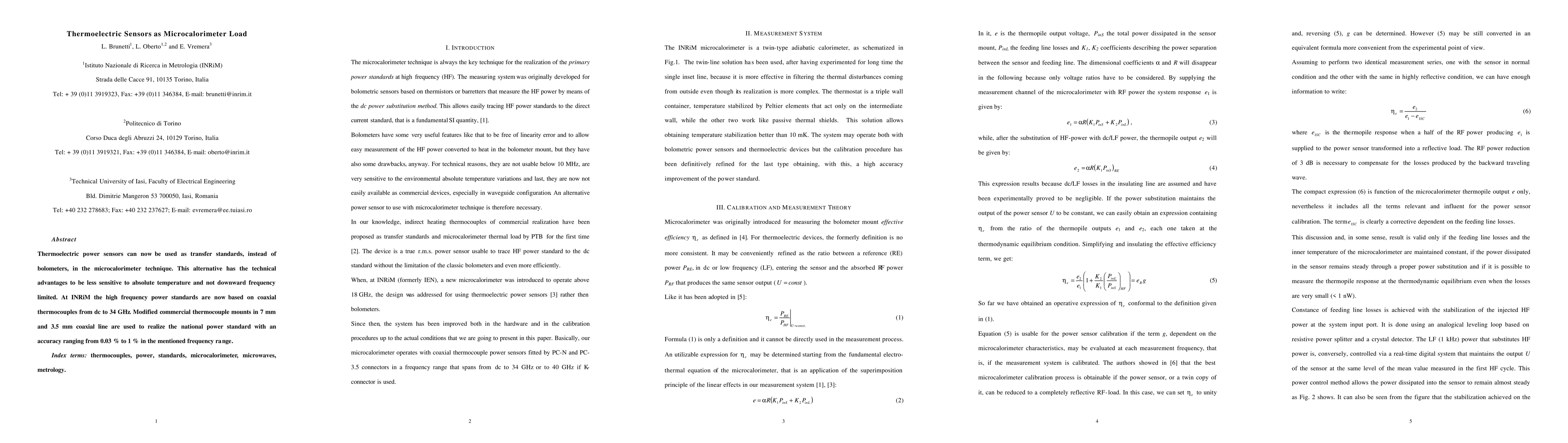 This paper explores the use of thermoelectric power sensors as an alternative to bolometers in microcalorimetry, highlighting their technical benefits such as reduced sensitivity to temperature and lack of frequency limitations. At INRiM, coaxial thermocouples are employed for high-frequency power standards, achieving accuracy from 0.03% to 1% up to 34 GHz.