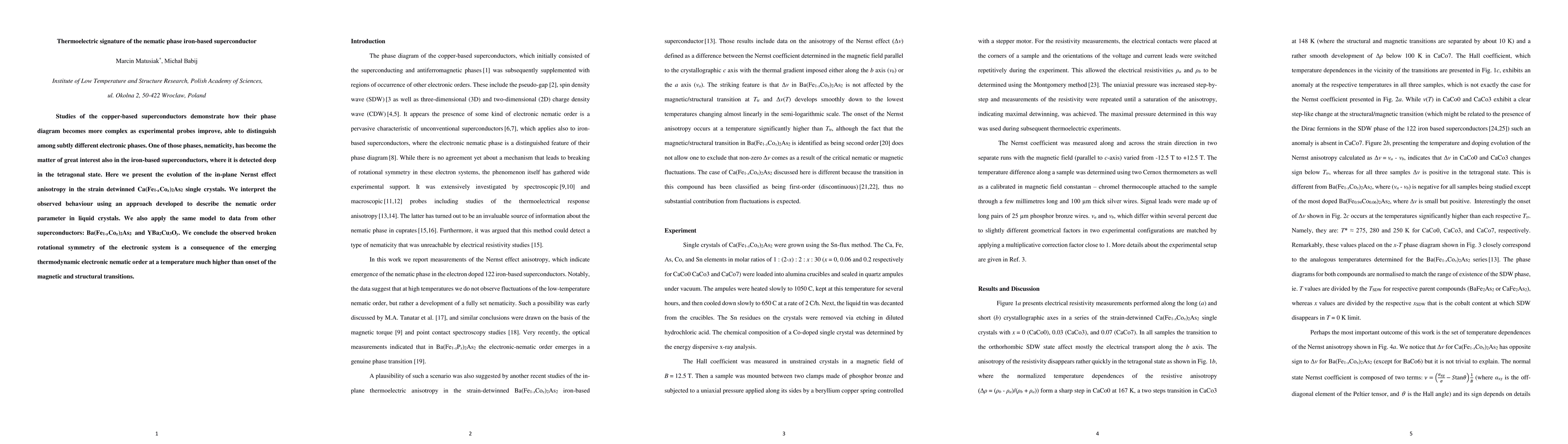 This study investigates the nematic phase in iron-based superconductors through the in-plane Nernst effect anisotropy in Ca(Fe1-xCox)2As2 crystals, revealing a broken rotational symmetry indicative of thermodynamic electronic nematic order above magnetic and structural transitions. The method used is also applicable to other superconductors like Ba(Fe1-xCox)2As2 and YBa2Cu3Oy.