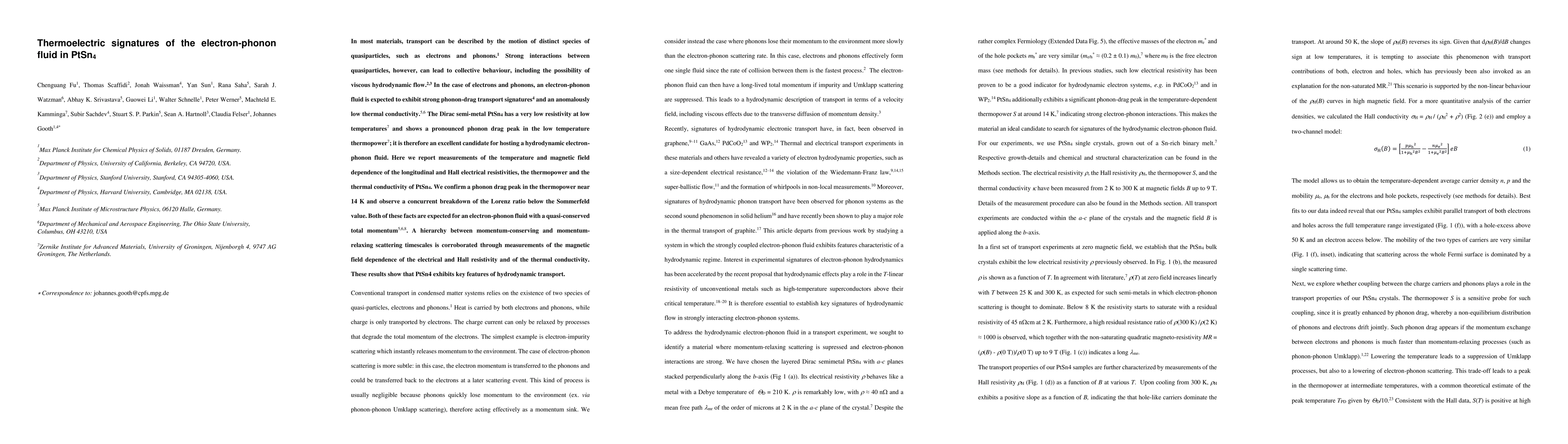 PtSn4 demonstrates strong electron-phonon fluid behavior, confirmed by a phonon drag peak in thermopower and a low Lorenz ratio below the Sommerfeld value, indicating hydrodynamic transport features. Magnetic field dependence studies further reveal a hierarchy in scattering timescales, supporting the existence of a quasi-conserved total momentum.