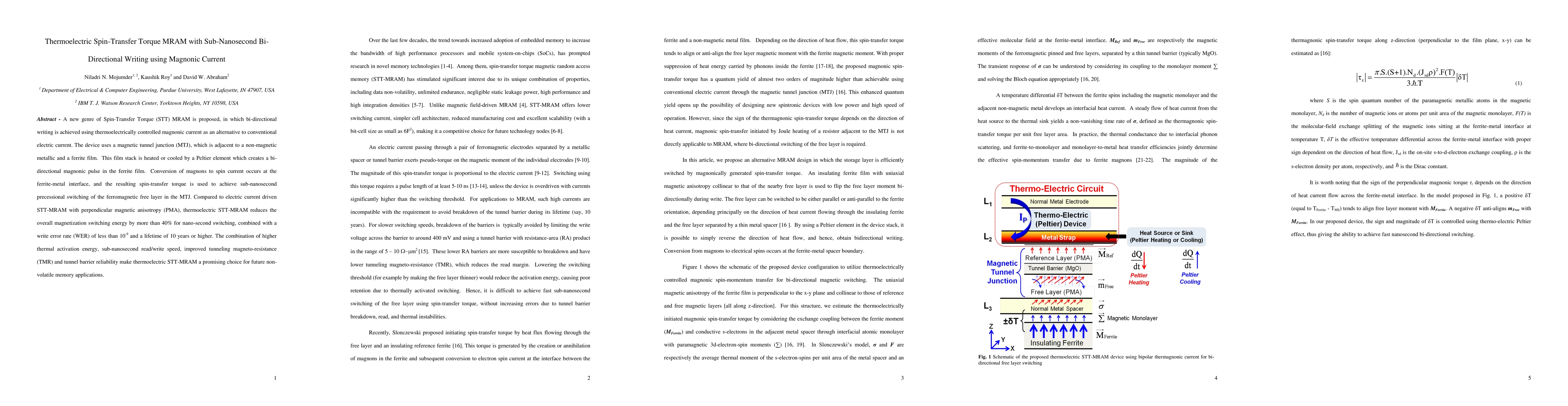 This paper proposes a novel thermoelectrically controlled Spin-Transfer Torque MRAM utilizing magnonic current for bi-directional writing, achieving sub-nanosecond switching with reduced energy consumption and improved reliability compared to conventional electric current-driven MRAM.