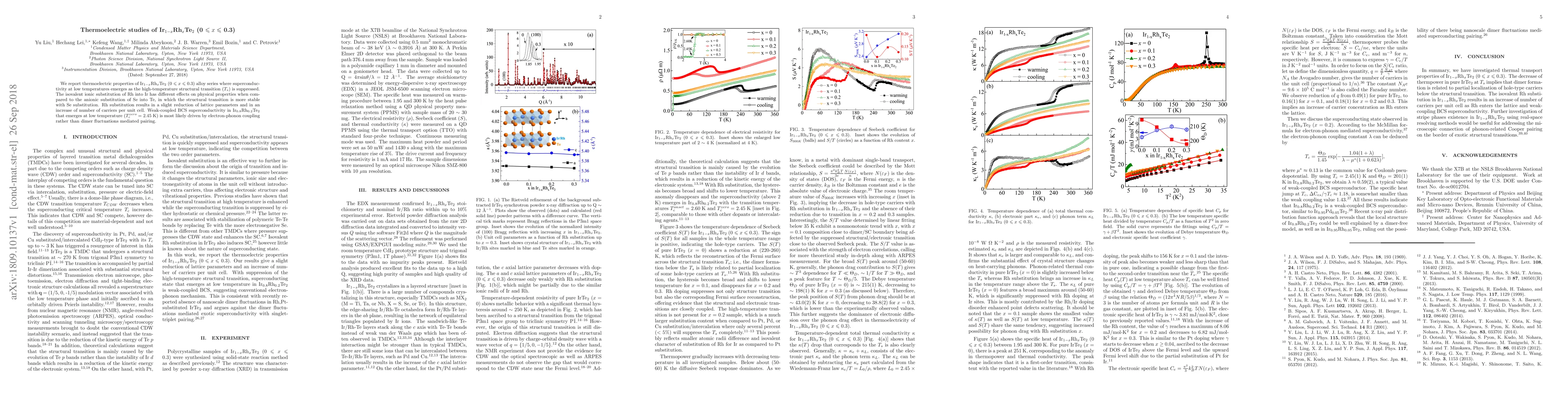 We report thermoelectric properties of Ir$_{1-x}$Rh$_x$Te$_2$ ($0 \leqslant x \leqslant 0.3$) alloy series where superconductivity at low temperatures emerges as the high-temperature structural transition ($T_s$) is suppressed. The isovalent ionic substitution of Rh into Ir has different effects on physical properties when compared to the anionic substitution of Se into Te, in which the structural transition is more stable with Se substitution. Rh substitution results in a slight reduction of lattice parameters and in an increase of number of carriers per unit cell. Weak-coupled BCS superconductivity in Ir$_{0.8}$Rh$_{0.2}$Te$_2$ that emerges at low temperature ($T_c^{zero}$ = 2.45 K) is most likely driven by electron-phonon coupling rather than dimer fluctuations mediated pairing.