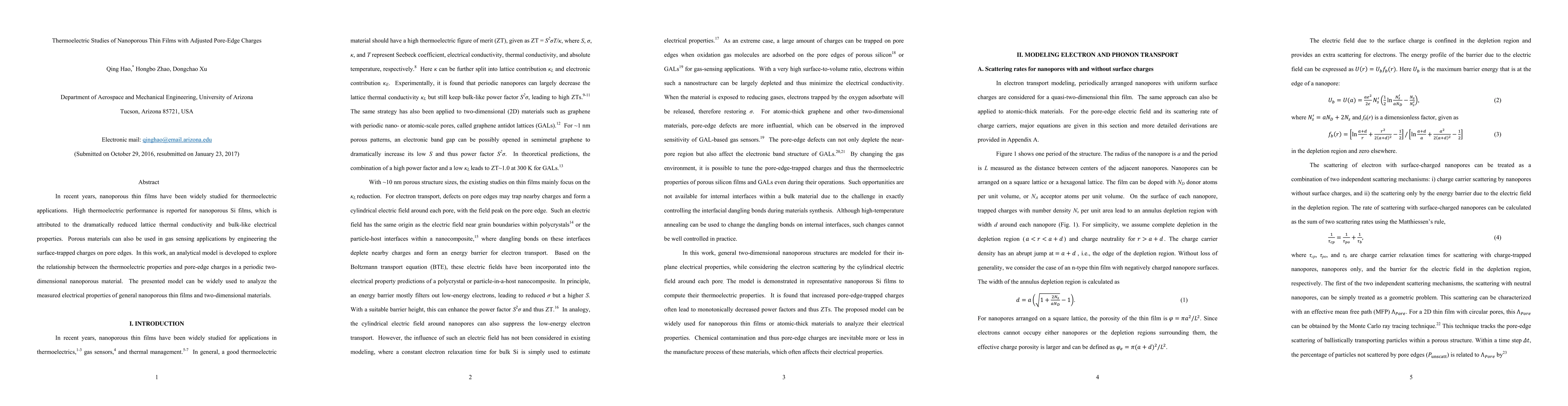 This paper develops an analytical model to investigate the relationship between thermoelectric performance and pore-edge charges in nanoporous thin films, attributing high thermoelectric efficiency to reduced lattice thermal conductivity while exploring applications in gas sensing via engineered surface charges. The model is applicable for analyzing electrical properties in general nanoporous thin films and two-dimensional materials.