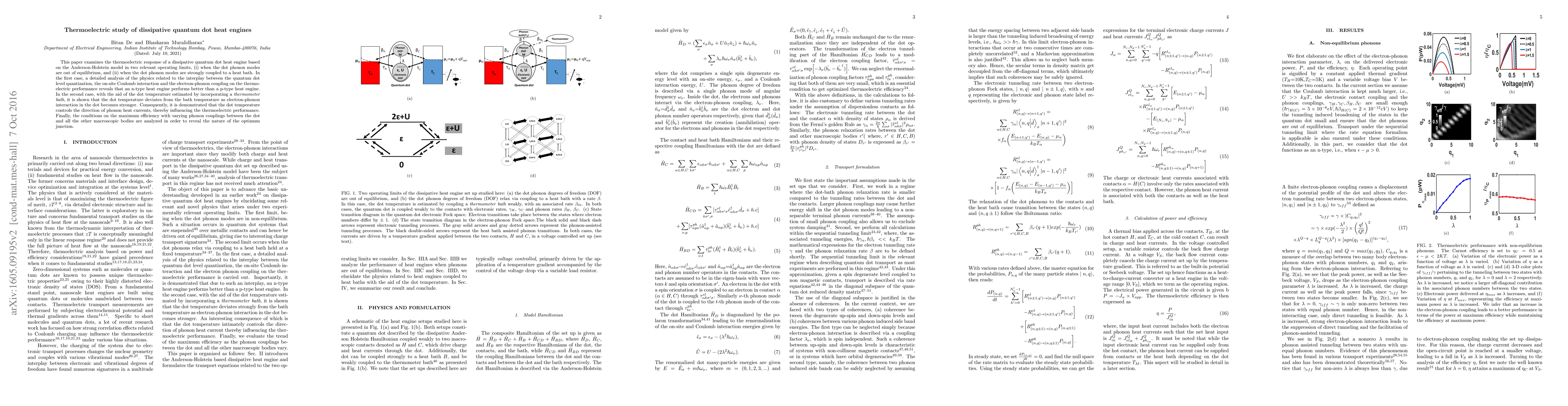 This paper investigates the thermoelectric response of a dissipative quantum dot heat engine using the Anderson-Holstein model, showing that n-type engines outperform p-type when phonon modes are out of equilibrium, and that stronger electron-phonon interactions lead to temperature deviations influencing phonon heat currents and overall efficiency.