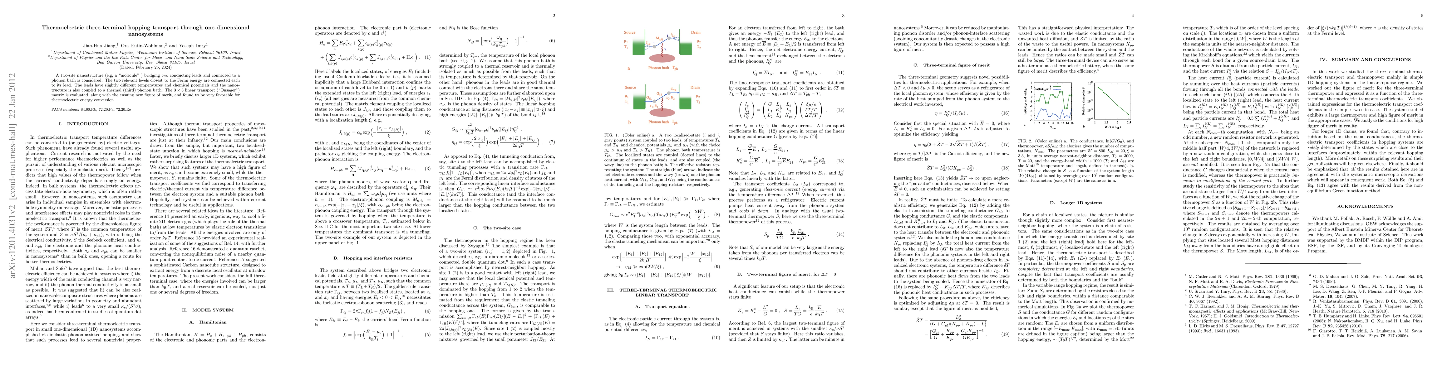 A two-site nanostructure (e.g, a "molecule") bridging two conducting leads and connected to a phonon bath is considered. The two relevant levels closest to the Fermi energy are connected each to its lead. The leads have slightly different temperatures and chemical potentials and the nanos- tructure is also coupled to a thermal (third) phonon bath. The 3 x 3 linear transport ("Onsager") matrix is evaluated, along with the ensuing new figure of merit, and found to be very favorable for thermoelectric energy conversion.