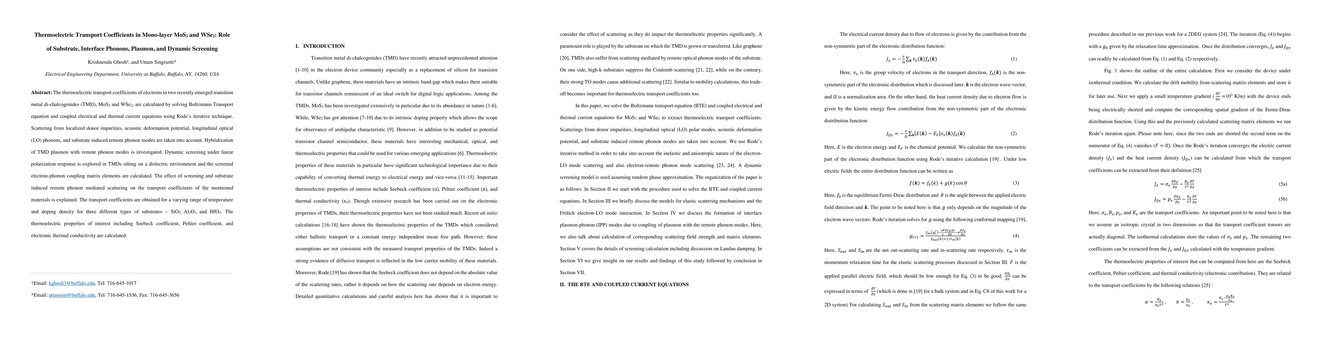 This study investigates the thermoelectric transport coefficients in monolayer MoS2 and WSe2, considering substrate effects, interface phonons, plasmon hybridization, and dynamic screening. The research calculates thermoelectric properties like Seebeck and Peltier coefficients for various substrates and doping densities.