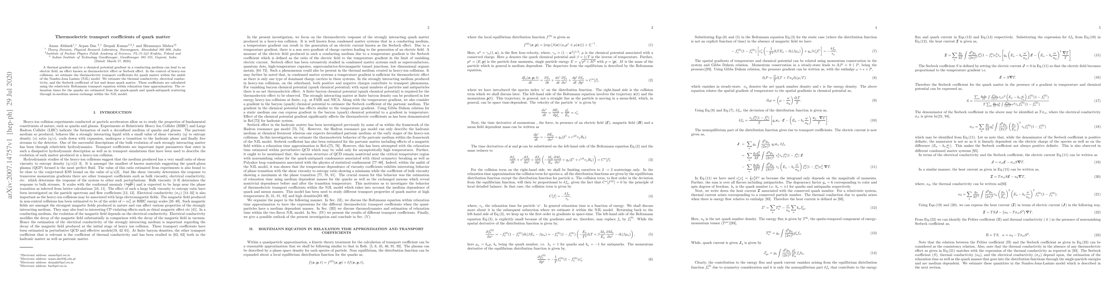 This paper estimates thermoelectric transport coefficients—thermal conductivity, electrical conductivity, and the Seebeck coefficient—for quark matter in heavy-ion collisions using the Nambu-Jona Lasinio model. The calculations are performed via the relativistic Boltzmann transport equation, with relaxation times derived from quark-meson interactions.
