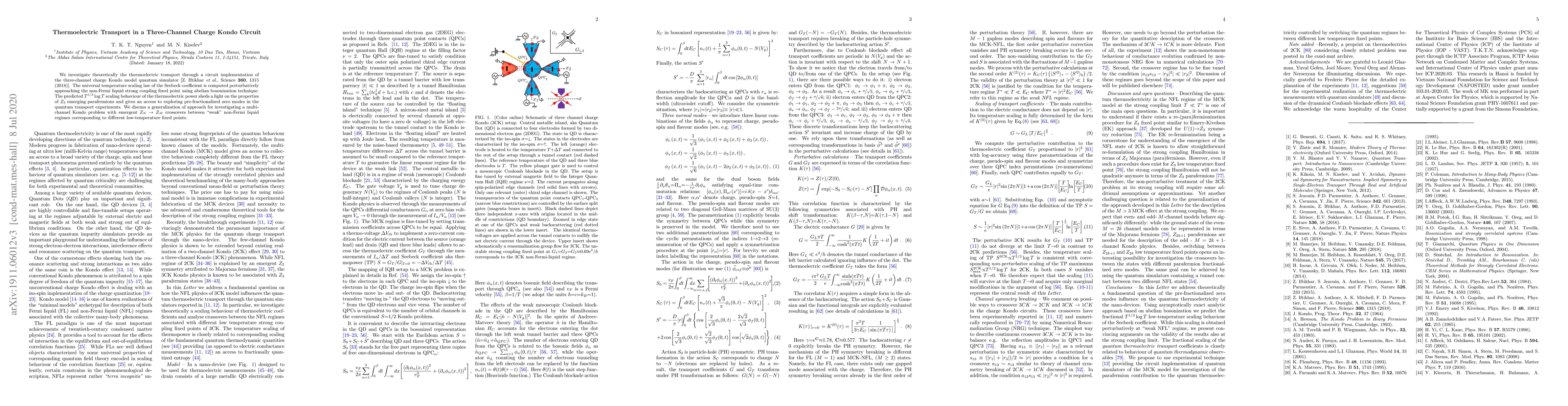 This paper theoretically explores thermoelectric transport in a three-channel charge Kondo circuit, predicting a $T^{1/3}\log T$ scaling behavior of the thermoelectric power. The study uses abelian bosonization to approach the non-Fermi liquid strong coupling fixed point, revealing insights into $Z_3$ parafermions and pre-fractionalized zero modes.