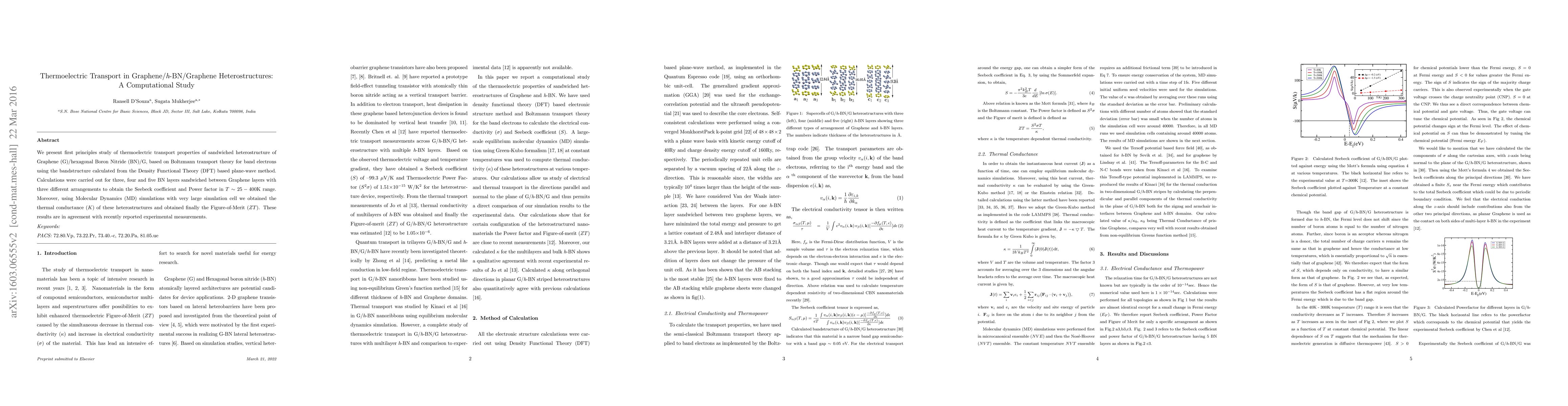 This study computationally investigates thermoelectric transport in Graphene/h-BN/Graphene heterostructures using DFT and Boltzmann transport theory, finding the Seebeck coefficient, Power factor, and Figure-of-Merit ($ZT$) across various BN layer counts and configurations, which align with recent experimental results.