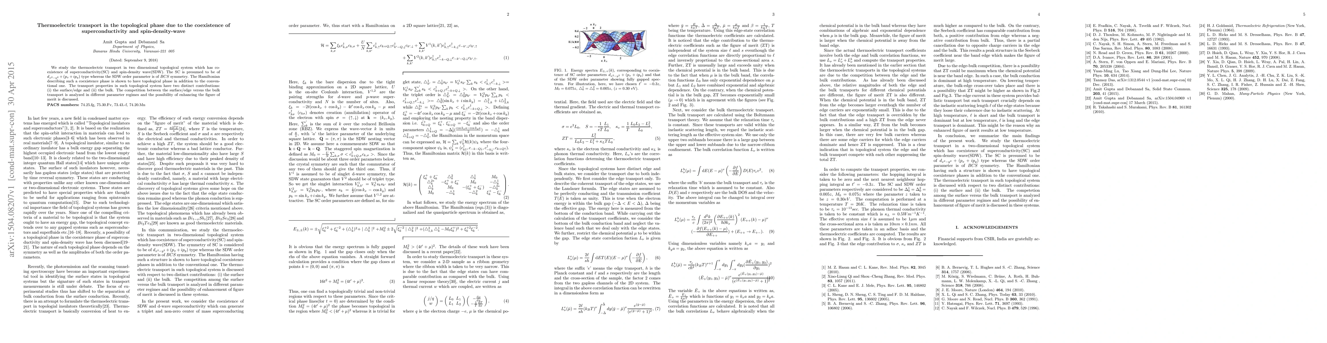 The paper presents a detailed analysis of thermoelectric transport in a topological system with coexisting superconductivity and spin-density wave, identifying distinct edge and bulk contributions and discussing their competition.
