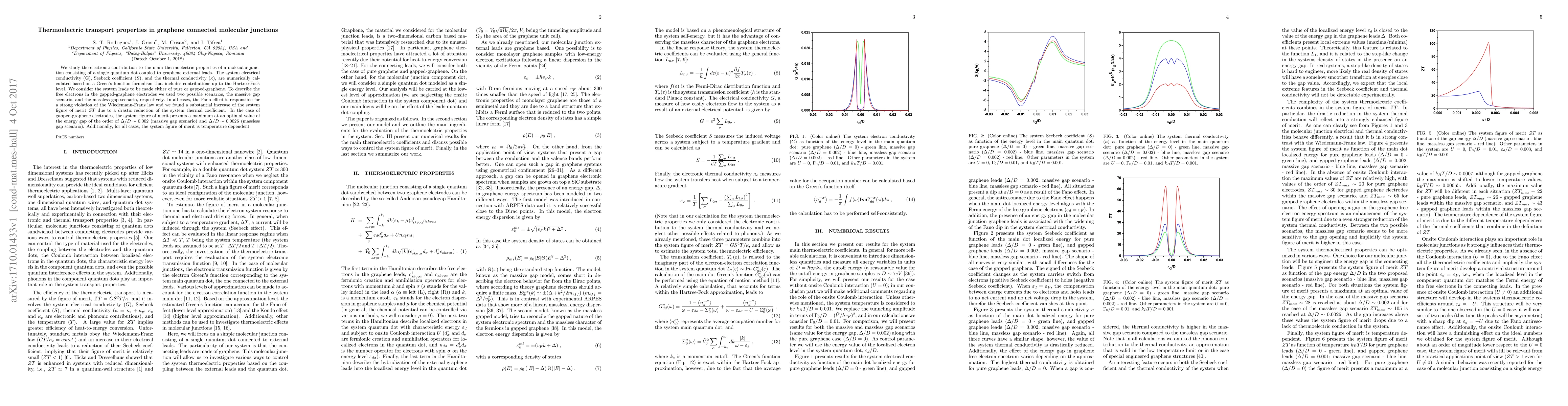 We study the electronic contribution to the main thermoelectric properties of a molecular junction consisting of a single quantum dot coupled to graphene external leads. The system electrical conductivity (G), Seebeck coefficient ($S$), and the thermal conductivity ($\kappa$), are numerically calculated based on a Green's function formalism that includes contributions up to the Hartree-Fock level. We consider the system leads to be made either of pure or gapped-graphene. To describe the free electrons in the gapped-graphene electrodes we used two possible scenarios, the massive gap scenario, and the massless gap scenario, respectively. In all cases, the Fano effect is responsible for a strong violation of the Wiedemann-Franz law and we found a substantial increase of the system figure of merit $ZT$ due to a drastic reduction of the system thermal coefficient. In the case of gapped-graphene electrodes, the system figure of merit presents a maximum at an optimal value of the energy gap of the order of $\Delta/D\sim$ 0.002 (massive gap scenario) and $\Delta/D\sim$ 0.0026 (massless gap scenario). Additionally, for all cases, the system figure of merit is temperature dependent.