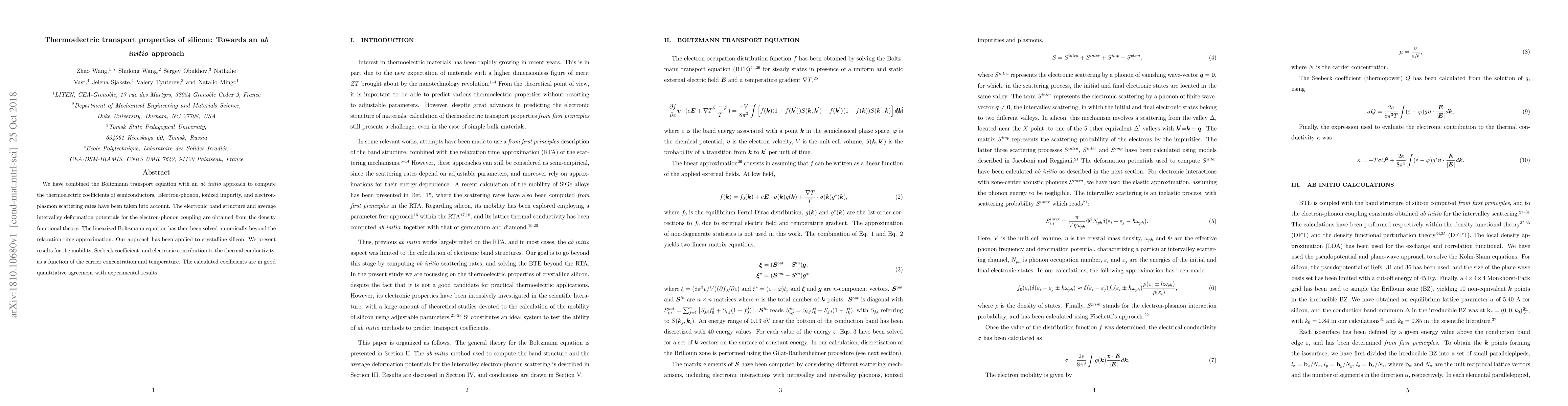 This study combines the Boltzmann transport equation with ab initio methods to calculate the thermoelectric properties of silicon, accounting for electron-phonon, ionized impurity, and electron-plasmon scattering. The results for mobility, Seebeck coefficient, and electronic thermal conductivity agree well with experimental data.