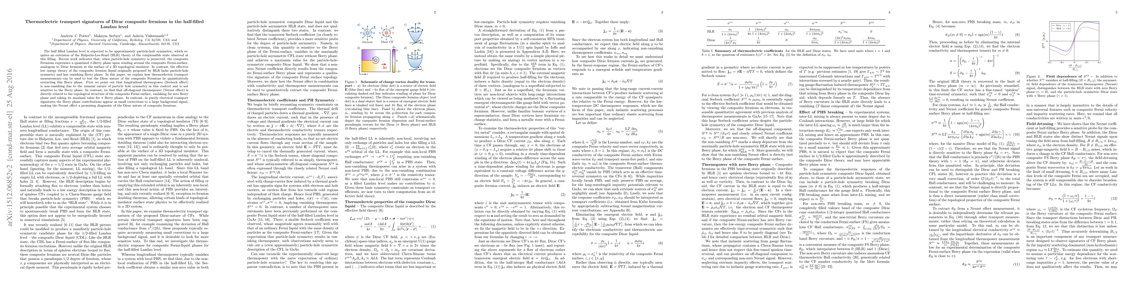 The half filled Landau level is expected to be approximately particle-hole symmetric, which requires an extension of the Halperin-Lee-Read (HLR) theory of the compressible state observed at this filling. Recent work indicates that, when particle-hole symmetry is preserved, the composite Fermions experience a quantized $\pi$-Berry phase upon winding around the composite Fermi-surface, analogous to Dirac fermions at the surface of a 3D topological insulator. In contrast, the effective low energy theory of the composite fermion liquid originally proposed by HLR lacks particle-hole symmetry and has vanishing Berry phase. In this paper, we explain how thermoelectric transport measurements can be used to test the Dirac nature of the composite Fermions by quantitatively extracting this Berry phase. First we point out that longitudinal thermopower (Seebeck effect) is non-vanishing due to the unusual nature of particle hole symmetry in this context and is not sensitive to the Berry phase. In contrast, we find that off-diagonal thermopower (Nernst effect) is directly related to the topological structure of the composite Fermi surface, vanishing for zero Berry phase and taking its maximal value for $\pi$ Berry phase. In contrast, in purely electrical transport signatures the Berry phase contributions appear as small corrections to a large background signal, making the Nernst effect a promising diagnostic of the Dirac nature of composite fermions.