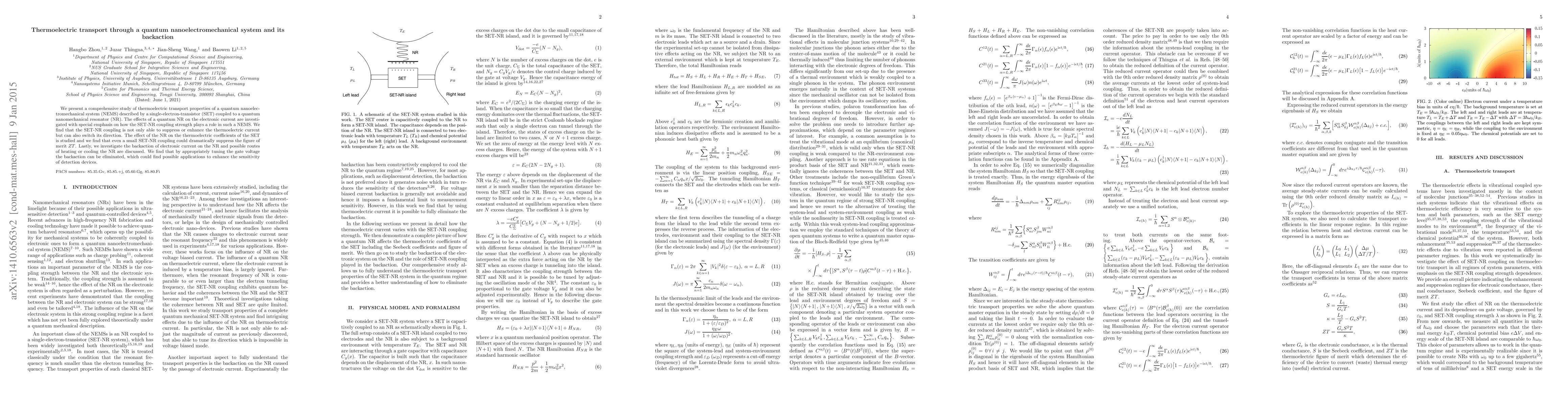 We present a comprehensive study of thermoelectric transport properties of a quantum nanoelectromechanical system (NEMS) described by a single-electron-transistor (SET) coupled to a quantum nanomechanical resonator (NR). The effects of a quantum NR on the electronic current are investigated with special emphasis on how the SET-NR coupling strength plays a role in such a NEMS. We find that the SET-NR coupling is not only able to suppress or enhance the thermoelectric current but can also switch its direction. The effect of the NR on the thermoelectric coefficients of the SET are studied and we find that even a small SET-NR coupling could dramatically suppress the figure of merits ZT . Lastly, we investigate the backaction of electronic current on the NR and possible routes of heating or cooling the NR are discussed. We find that by appropriately tuning the gate voltage the backaction can be eliminated, which could find possible applications to enhance the sensitivity of detection devices.