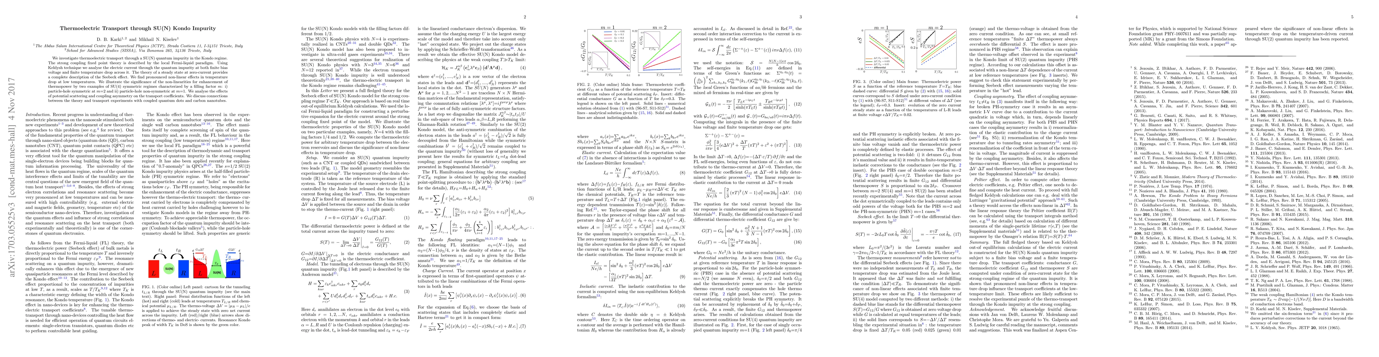 This paper explores thermoelectric transport in SU(N) quantum impurity systems within the Kondo regime, revealing pronounced non-linear effects in temperature drop at low temperatures. It provides a detailed analysis of the Seebeck effect and discusses the impact of potential scattering and coupling asymmetry on transport coefficients, with implications for experiments involving quantum dots and carbon nanotubes.