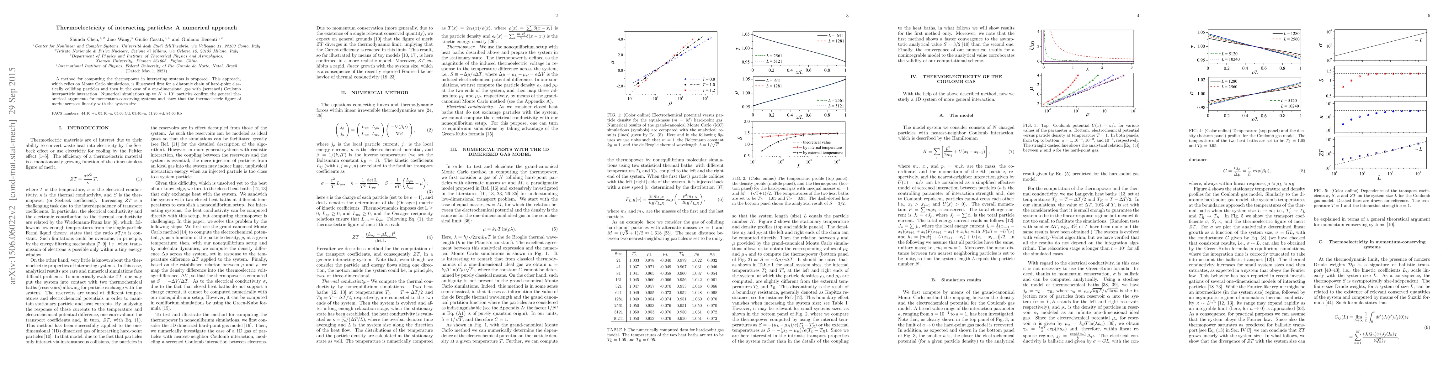 A method for computing the thermopower in interacting systems is proposed. This approach, which relies on Monte Carlo simulations, is illustrated first for a diatomic chain of hard-point elastically colliding particles and then in the case of a one-dimensional gas with (screened) Coulomb interparticle interaction. Numerical simulations up to $N>10^4$ particles confirm the general theoretical arguments for momentum-conserving systems and show that the thermoelectric figure of merit increases linearly with the system size.