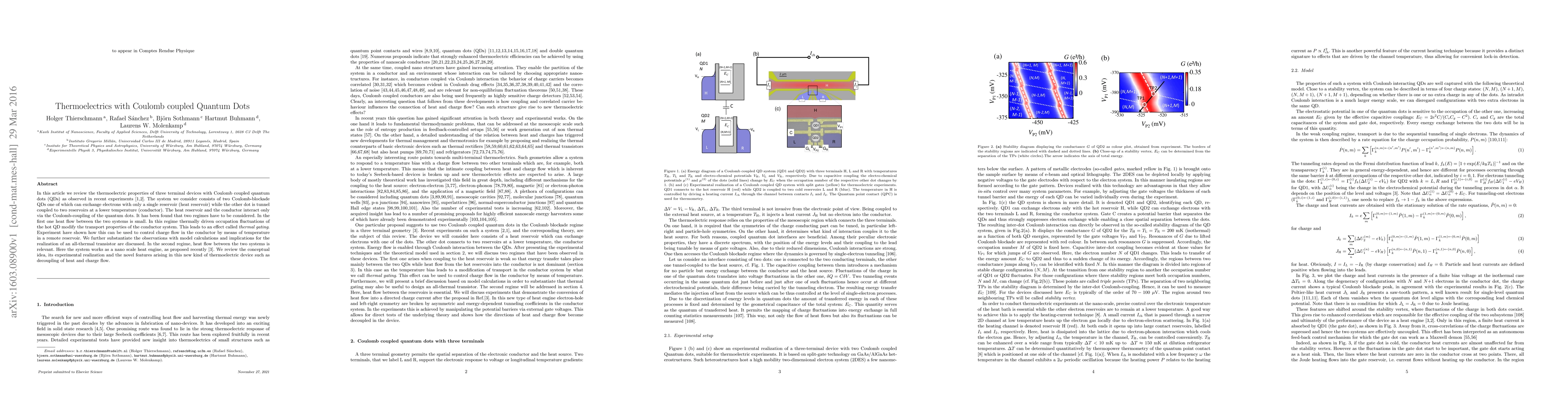 This paper reviews thermoelectric properties in three-terminal devices with Coulomb-coupled quantum dots, highlighting thermal gating and nanoscale heat engine functionalities. Experiments demonstrate remote temperature control of charge flow and novel decoupling of heat and charge transport.