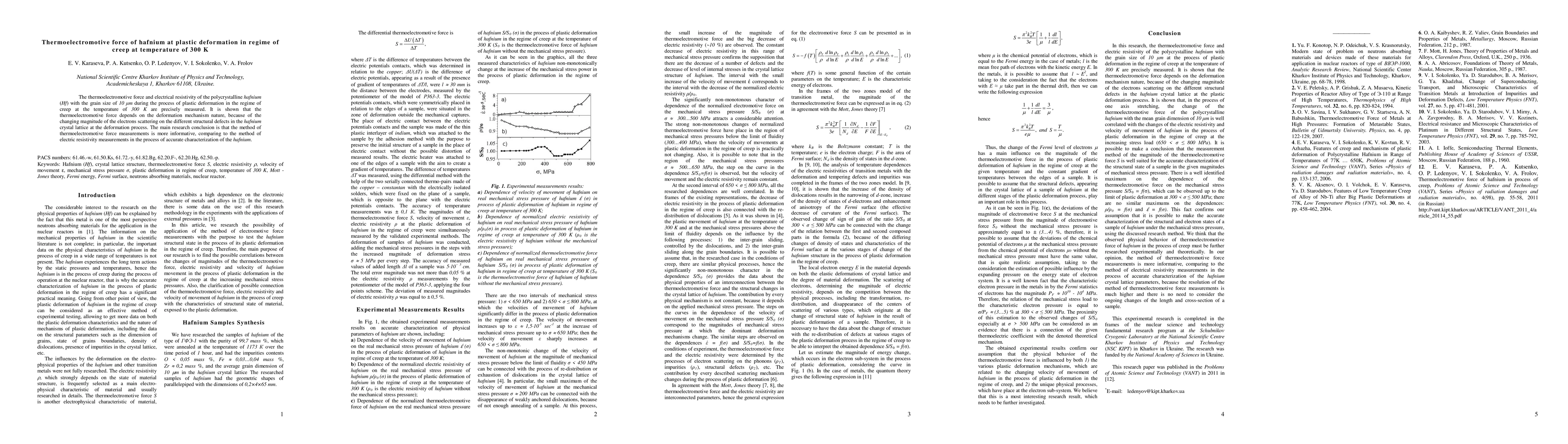 The study establishes a relationship between thermoelectromotive force, velocity of movement, and electric resistivity in hafnium under plastic deformation in the creep regime, highlighting the influence of electron scattering on structural defects.