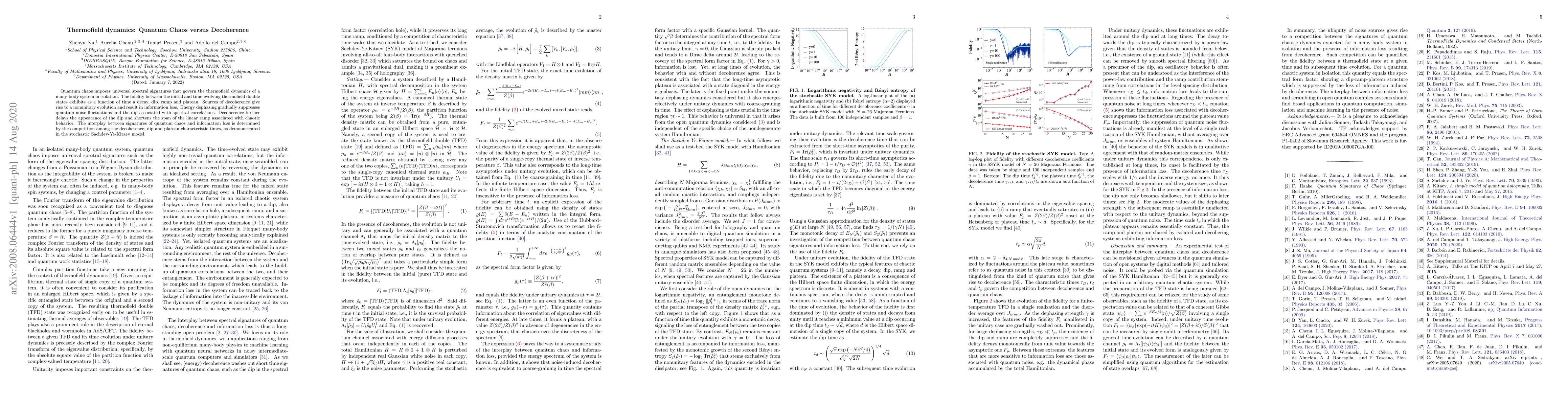 Quantum chaos imposes universal spectral signatures that govern the thermofield dynamics of a many-body system in isolation. The fidelity between the initial and time-evolving thermofield double states exhibits as a function of time a decay, dip, ramp and plateau. Sources of decoherence give rise to a nonunitary evolution and result in information loss. Energy dephasing gradually suppresses quantum noise fluctuations and the dip associated with spectral correlations. Decoherence further delays the appearance of the dip and shortens the span of the linear ramp associated with chaotic behavior. The interplay between signatures of quantum chaos and information loss is determined by the competition among the decoherence, dip and plateau characteristic times, as demoonstrated in the stochastic Sachdev-Ye-Kitaev model.