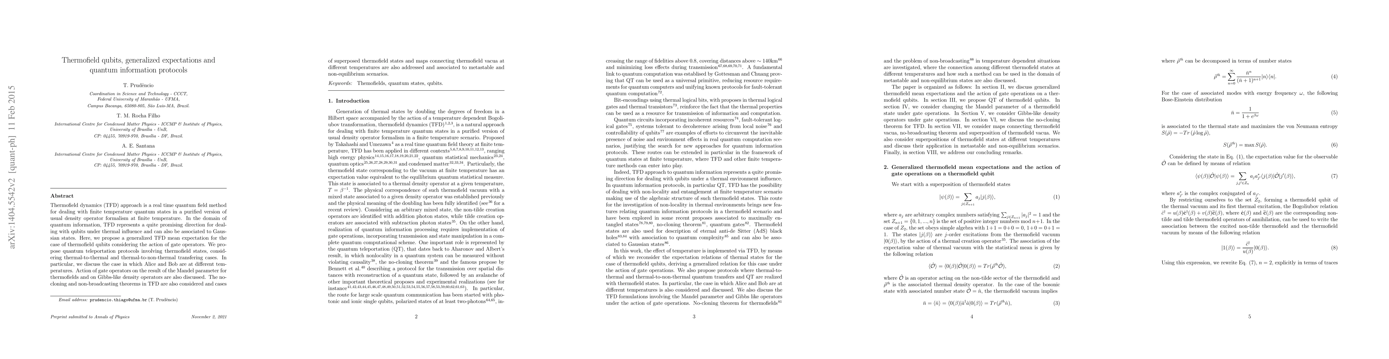 Thermofield dynamics (TFD) approach is a real time quantum field method for dealing with finite temperature quantum states in a purified version of usual density operator formalism at finite temperature. In the domain of quantum information, TFD represents a quite promising direction for dealing with qubits under thermal influence and can also be associated to Gaussian states. Here, we propose a generalized TFD mean expectation for the case of thermofield qubits considering the action of gate operators. We propose quantum teleportation protocols involving thermofield states, considering thermal-to-thermal and thermal-to-non-thermal transfering cases. In particular, we discuss the case in which Alice and Bob are at different temperatures. Action of gate operators on the result of the Mandel parameter for thermofields and on Gibbs-like density operators are also discussed. The no-cloning and non-broadcasting theorems in TFD are also considered and cases of superposed thermofield states and maps connecting thermofield vacua at different temperatures are also addressed and associated to metastable and non-equilibrium scenarios.