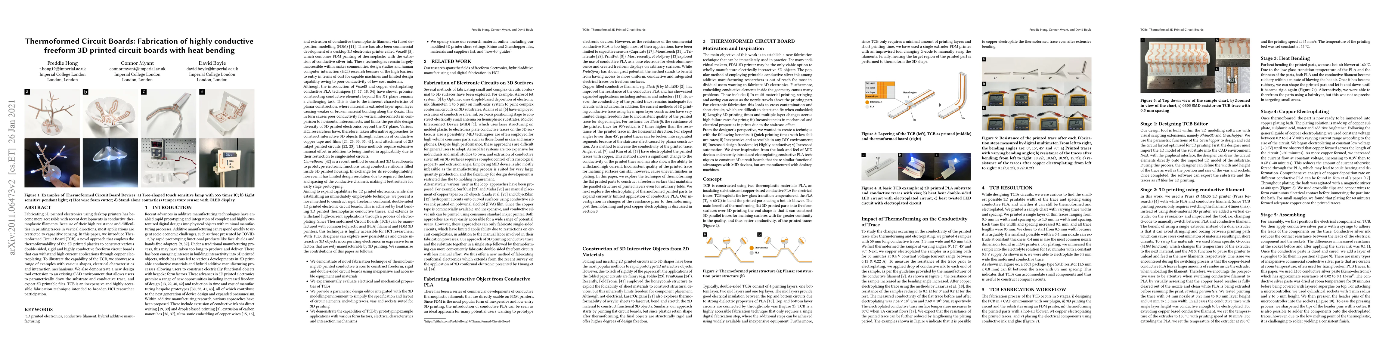 The research introduces Thermoformed Circuit Boards (TCB), a novel approach using thermoformability of 3D printed plastics to construct double-sided, rigid, and highly conductive freeform circuit boards through copper electroplating. The fabrication process involves designing in a CAD environment, 3D printing with conductive filament, heat bending, electroplating, and assembling components using conductive ink and glue.