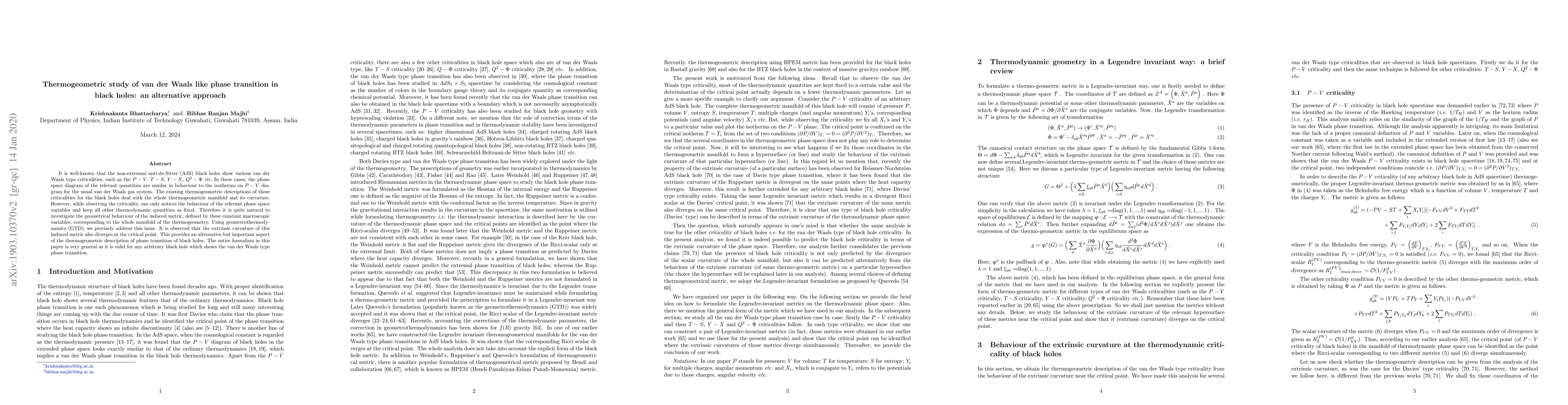 It is well-known that the non-extremal anti-de-Sitter (AdS) black holes show various van der Waals type criticalities, such as the $P-V$, $T-S$, $Y-X$, $Q^2-\Psi$ etc. In these cases, the phase space diagram of the relevant quantities are similar in behaviour to the isotherms on $P-V$ diagram for the usual van der Waals gas system. The existing thermogeometric descriptions of these criticalities for the black holes deal with the whole thermogeometric manifold and its curvature. However, while observing the criticality, one only notices the behaviour of the relevant phase space variables and keep all other thermodynamic quantities as fixed. Therefore it is quite natural to investigate the geometrical behaviour of the induced metric, defined by these constant macroscopic variables, corresponding to the whole manifold of the thermogeometry. Using geometrothermodynamics (GTD), we precisely address this issue. It is observed that the extrinsic curvature of this induced metric also diverges at the critical point. This provides an alternative but important aspect of the thermogeometric description of phase transition of black holes. The entire formalism in this paper is very general as it is valid for any arbitrary black hole which shows the van der Waals type phase transition.