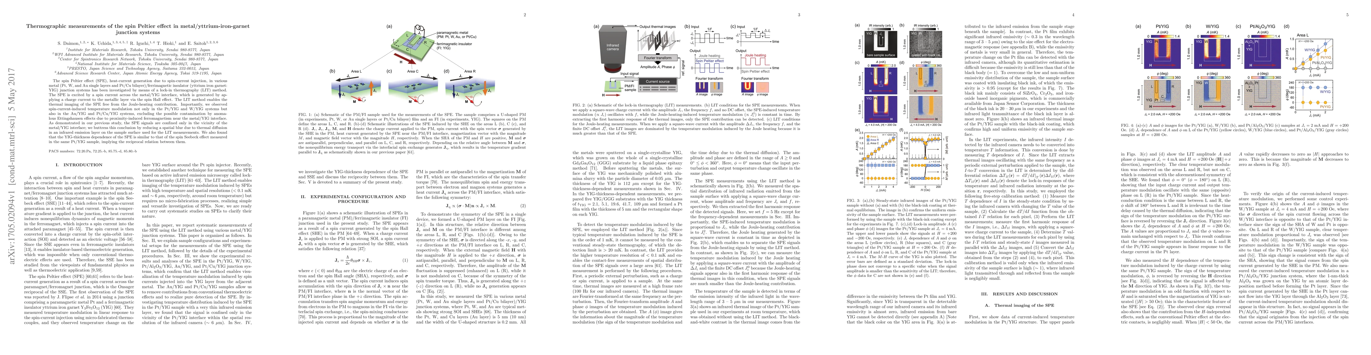 This paper investigates the spin Peltier effect (SPE) in various metal/yttrium-iron-garnet (YIG) junction systems using lock-in thermography, revealing temperature modulation due to spin currents in Pt/YIG, W/YIG, Au/YIG, and Pt/Cu/YIG systems without anomalous Ettingshausen effects. The study confirms the SPE's spatial confinement near the metal/YIG interface and finds a similar YIG-thickness dependence for SPE and the spin Seebeck effect.