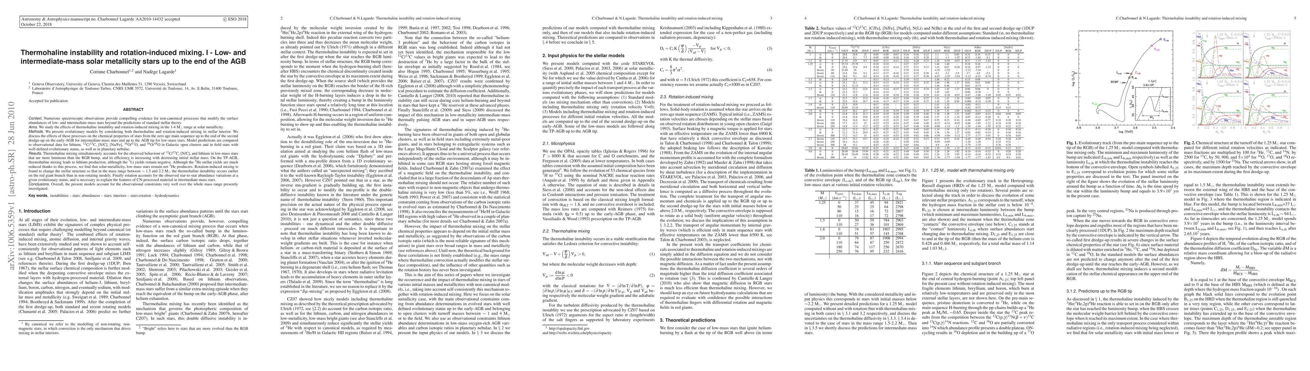 This paper investigates the effects of thermohaline instability and rotation-induced mixing on the chemical properties of low- to intermediate-mass stars up to the end of the AGB. It finds that thermohaline mixing explains observed abundance variations and lithium behavior, while rotation-induced mixing affects stellar structure and accounts for variations in CN-processed material.