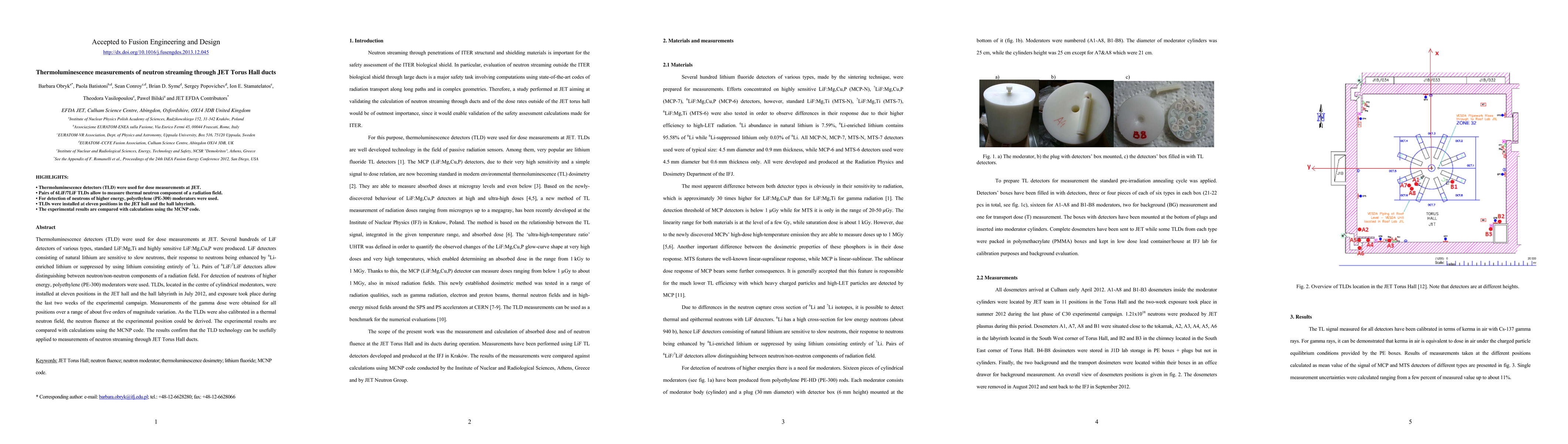 This study utilized thermoluminescence detectors (TLD) to measure neutron streaming through JET Torus Hall ducts, employing various LiF detectors and polyethylene moderators. Results confirm TLD technology's effectiveness for neutron dose measurements, validated by comparison with MCNP calculations.