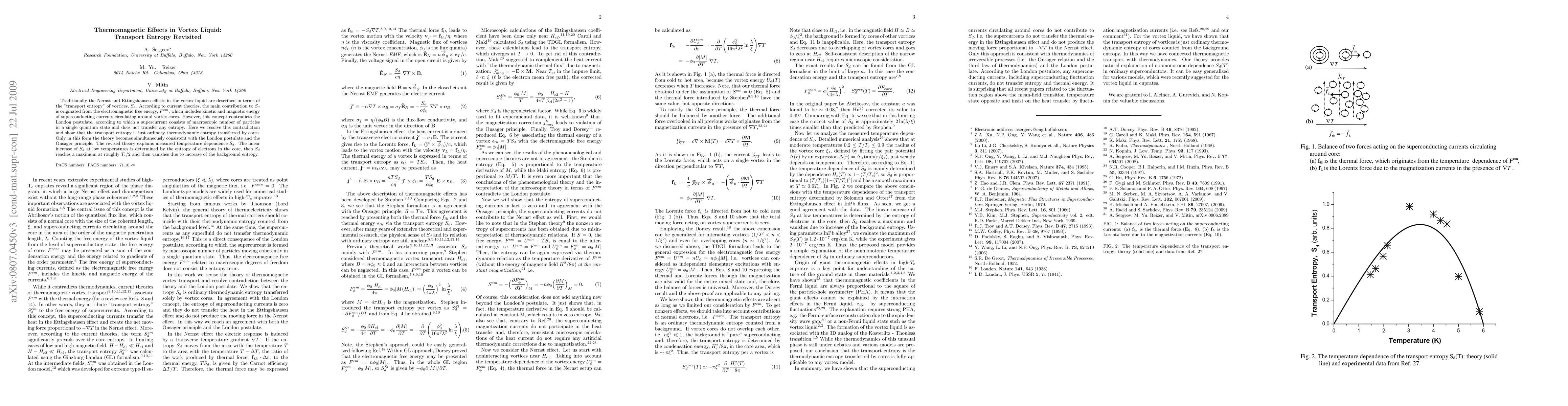 Traditionally the Nernst and Ettingshausen effects in the vortex liquid are described in terms of the "transport entropy" of vortices, S_d. According to current theories, the main contribution to S_d is originated from the electromagnetic free energy, F^{em}, which includes kinetic and magnetic energy of superconducting currents circulating around vortex cores. However, this concept contradicts the London postulate, according to which a supercurrent consists of macroscopic number of particles in a single quantum state and does not transfer any entropy. Here we resolve this contradiction and show that the transport entropy is just ordinary thermodynamic entropy transferred by cores. Only in this form the theory becomes simultaneously consistent with the London postulate and the Onsager principle. The revised theory explains measured temperature dependence S_d. The linear increase of S_d at low temperatures is determined by the entropy of electrons in the core, then S_d reaches a maximum at roughly T_c/2 and then vanishes due to increase of the background entropy.