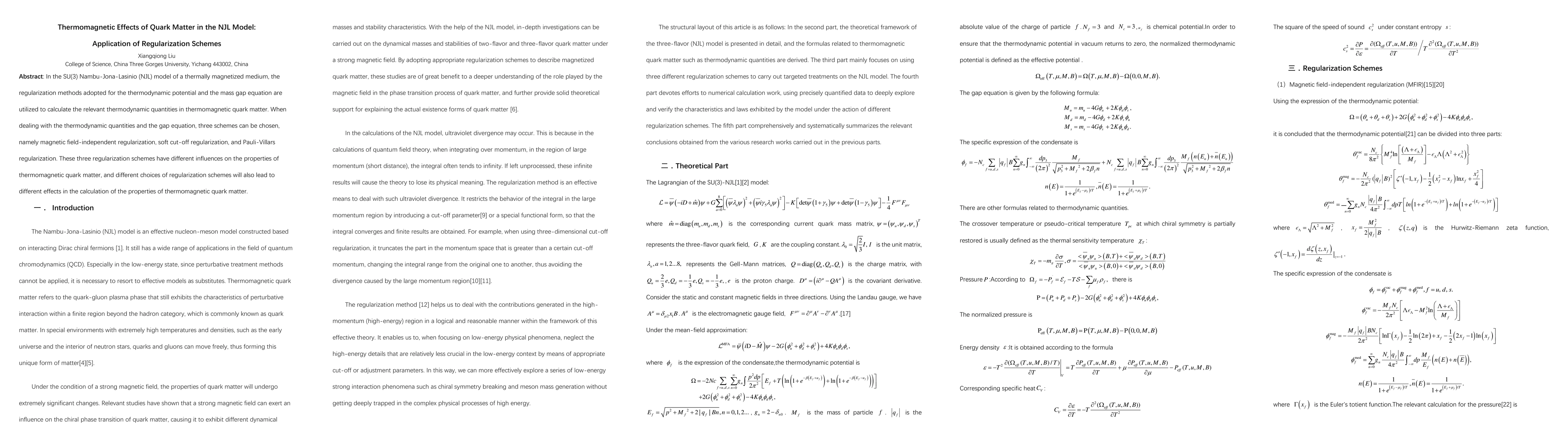 The study examines the thermomagnetic effects in quark matter using the SU(3) Nambu-Jona-Lasinio (NJL) model, focusing on how different regularization schemes—magnetic field-independent, soft cut-off, and Pauli-Villars—affect the thermodynamic quantities and mass gap equation of thermomagnetic quark matter. Each scheme produces distinct outcomes in the calculated properties of the medium.