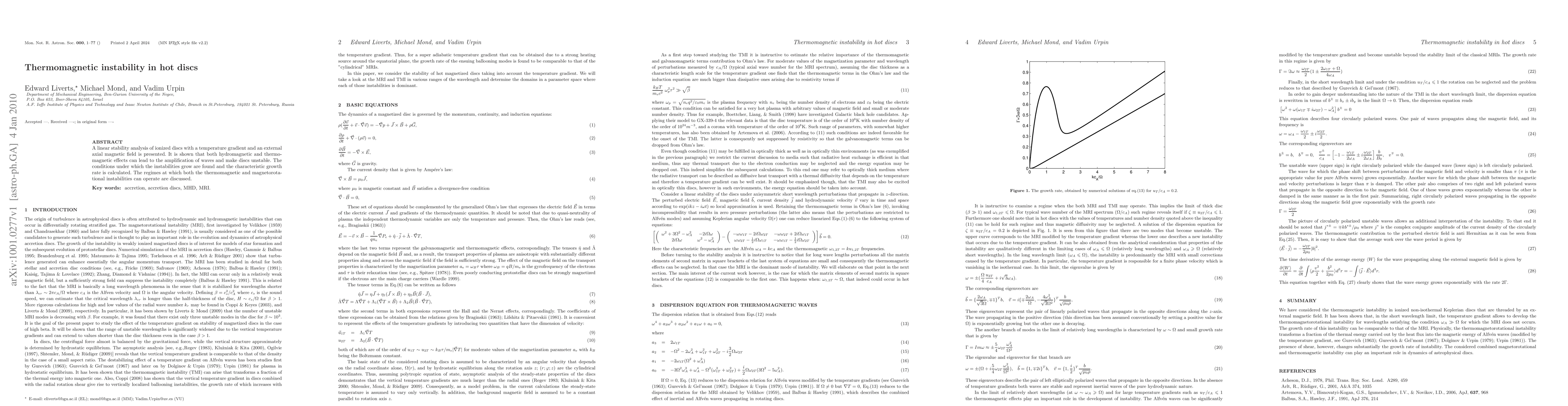 A linear stability analysis of ionized discs with a temperature gradient and an external axial magnetic field is presented. It is shown that both hydromagnetic and thermomagnetic effects can lead to the amplification of waves and make discs unstable. The conditions under which the instabilities grow are found and the characteristic growth rate is calculated. The regimes at which both the thermomagnetic and magnetorotational instabilities can operate are discussed.