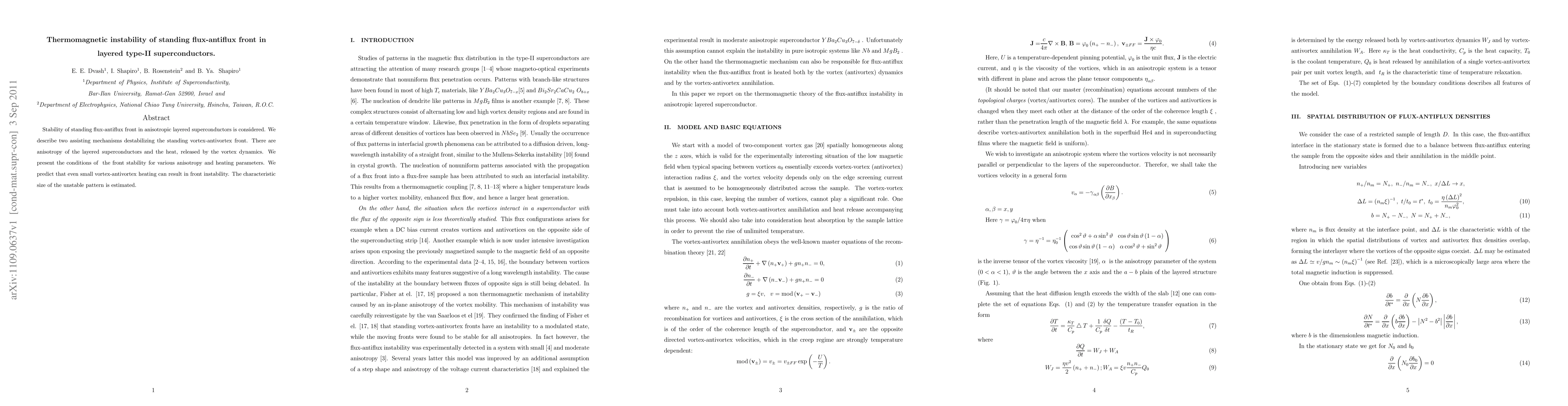 This paper investigates the thermomagnetic instability of standing flux-antiflux fronts in layered type-II superconductors, identifying anisotropy and vortex dynamics-induced heat as destabilizing mechanisms. The study predicts that minor heating can lead to instability, estimating the size of the resulting unstable pattern.