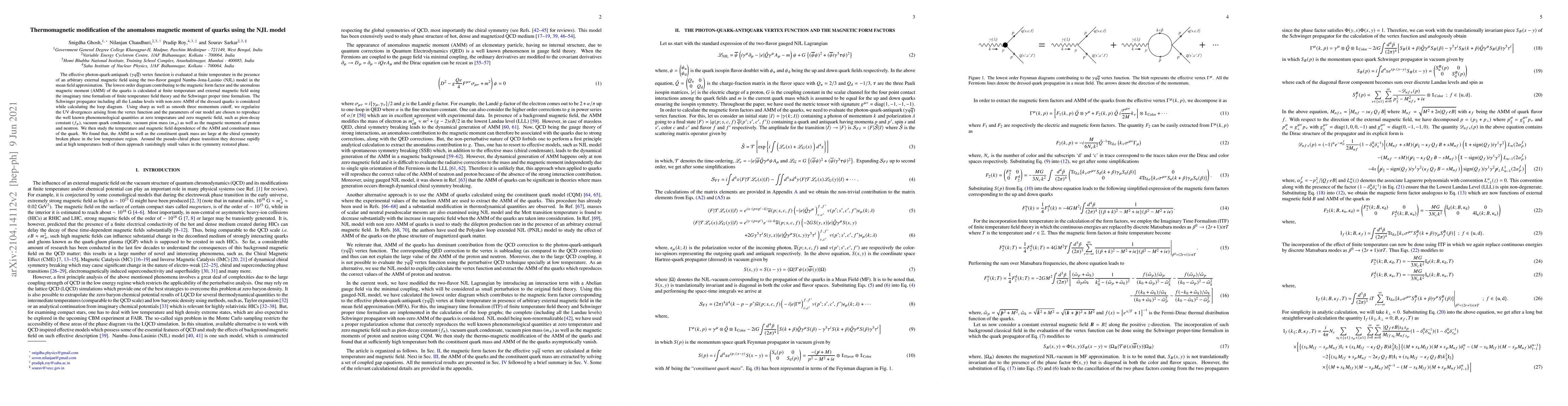 The paper presents a detailed calculation of the magnetic form factor and anomalous magnetic moment of quarks in a thermal and magnetic field environment using the NJL model, including all Landau levels with non-zero AMM of dressed quarks.