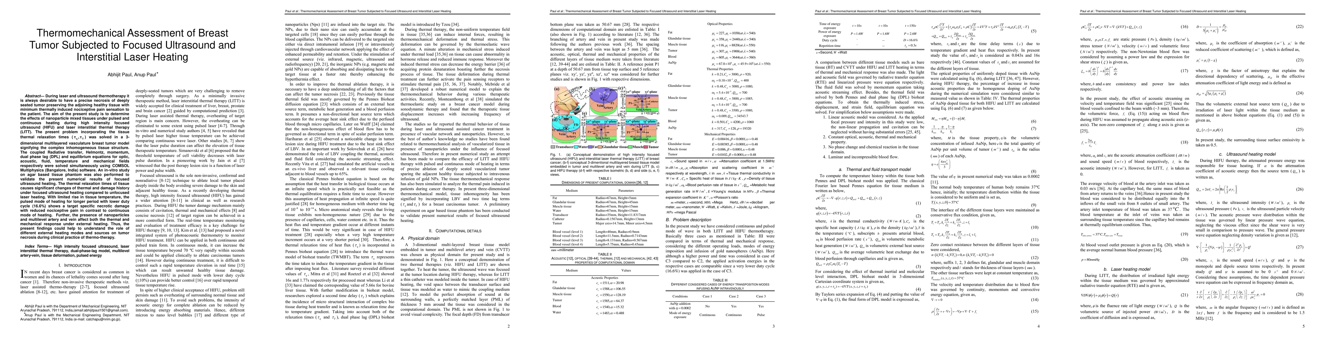 This study investigates the thermomechanical effects of breast tumor subjected to high intensity focused ultrasound (HIFU) and laser interstitial thermal therapy (LITT) with nanoparticle mixed tissues. Numerical simulations using COMSOL Multiphysics and an agar-based phantom validate that pulsed heating with lower duty cycles induces targeted necrosis with reduced pain compared to continuous heating, while considering tissue thermal relaxation times and complex tissue structures.