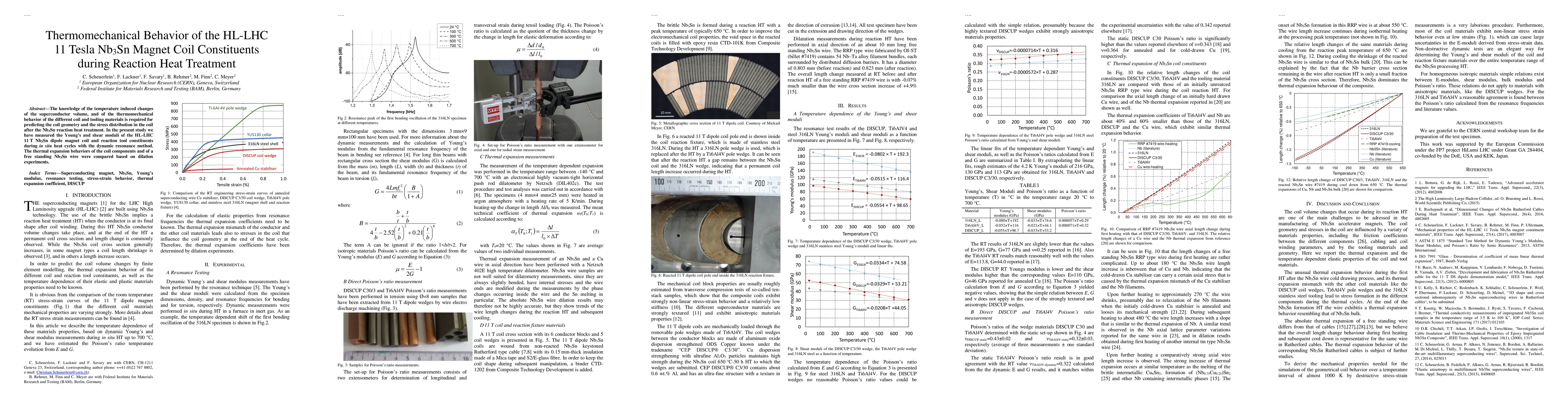 The knowledge of the temperature induced changes of the superconductor volume, and of the thermo-mechanical behaviour of the different coil and tooling materials is required for predicting the coil geometry and the stress distribution in the coil after the Nb3Sn reaction heat treatment. In the present study we have measured the Young's and shear moduli of the HL-LHC 11 T Nb3Sn dipole magnet coil and reaction tool constituents during in situ heat cycles with the dynamic resonance method. The thermal expansion behaviours of the coil components and of a free standing Nb3Sn wire were compared based on dilation experiments.