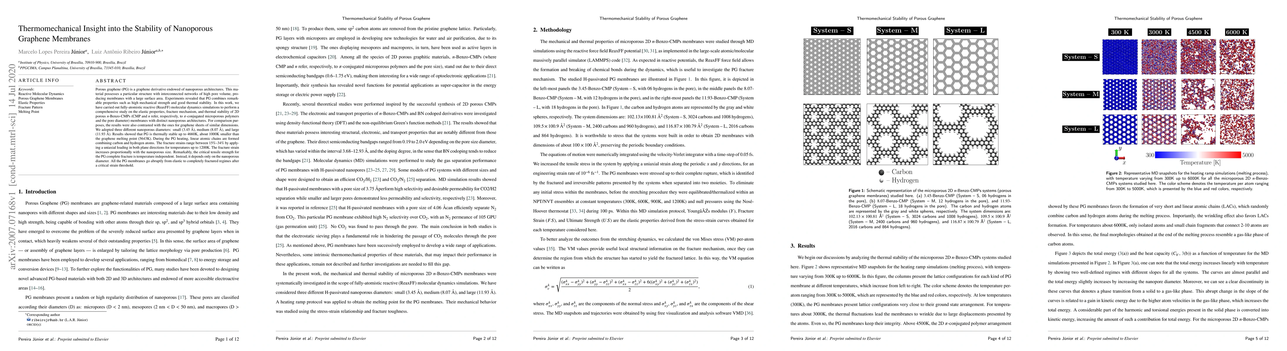 This paper investigates the thermomechanical properties of nanoporous graphene membranes using ReaxFF molecular dynamics simulations. The study reveals that these membranes exhibit high thermal stability up to 4660K and fracture strains ranging from 15%-34% under uniaxial loading, with fracture strain increasing with pore size.
