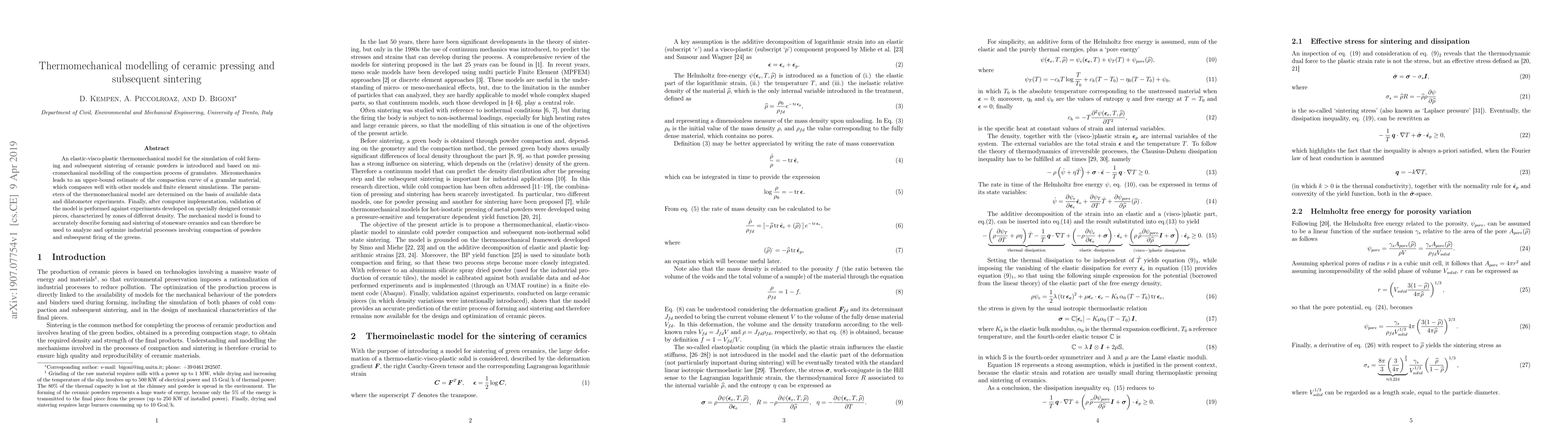 An elastic-visco-plastic thermomechanical model for the simulation of cold forming and subsequent sintering of ceramic powders is introduced and based on micromechanical modelling of the compaction process of granulates. Micromechanics leads to an upper-bound estimate of the compaction curve of a granular material, which compares well with other models and finite element simulations. The parameters of the thermomechanical model are determined on the basis of available data and dilatometer experiments. Finally, after computer implementation, validation of the model is performed against experiments developed on specially designed ceramic pieces, characterized by zones of different density. The mechanical model is found to accurately describe forming and sintering of stoneware ceramics and can therefore be used to analyze and optimize industrial processes involving compaction of powders and subsequent firing of the greens.
