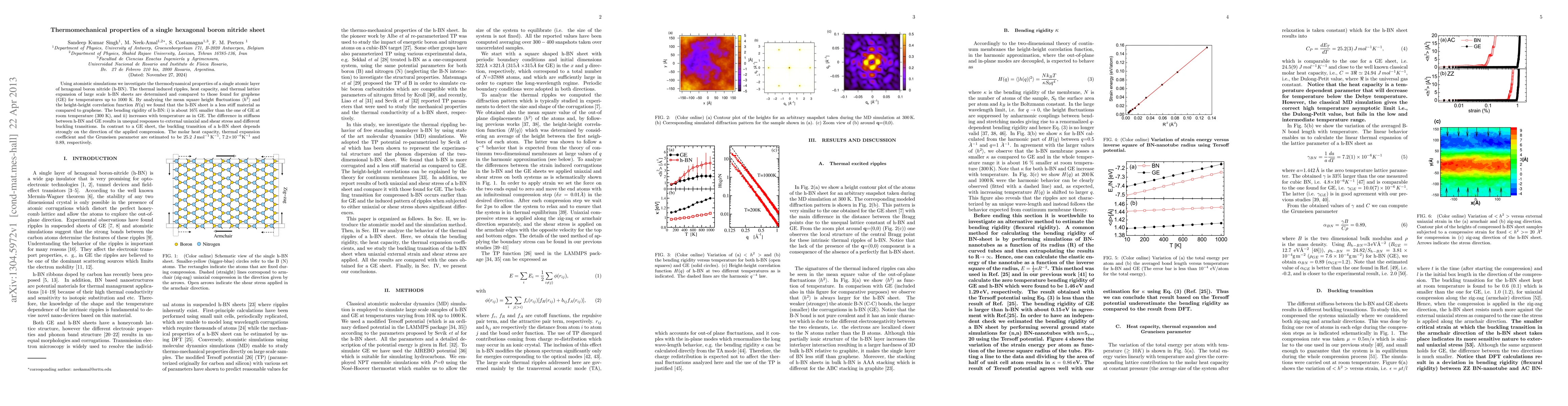 Using atomistic simulations we investigate the thermodynamical properties of a single atomic layer of hexagonal boron nitride (h-BN). The thermal induced ripples, heat capacity, and thermal lattice expansion of large scale h-BN sheets are determined and compared to those found for graphene (GE) for temperatures up to 1000 K. By analyzing the mean square height fluctuations $< h^2>$ and the height-height correlation function $H(q)$ we found that the h-BN sheet is a less stiff material as compared to graphene. The bending rigidity of h-BN: i) is about 16% smaller than the one of GE at room temperature (300 K), and ii) increases with temperature as in GE. The difference in stiffness between h-BN and GE results in unequal responses to external uniaxial and shear stress and different buckling transitions. In contrast to a GE sheet, the buckling transition of a h-BN sheet depends strongly on the direction of the applied compression. The molar heat capacity, thermal expansion coefficient and the Gruneisen parameter are estimated to be 25.2 J\,mol$^{-1}$\,K$^{-1}$, 7.2$\times10^{-6}$K$^{-1}$ and 0.89, respectively.