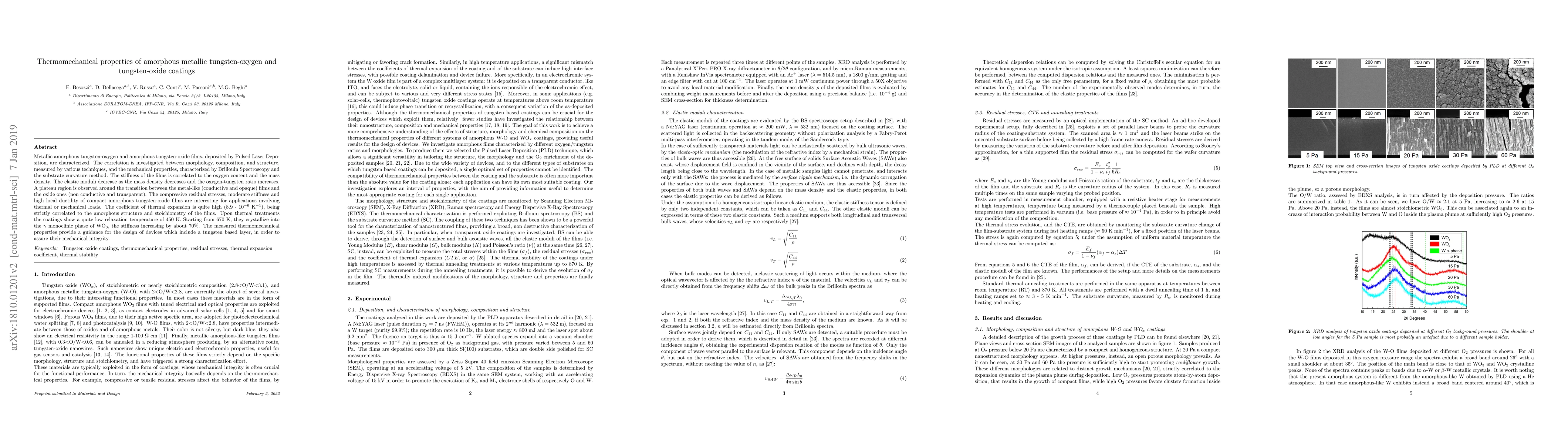 This study explores the thermomechanical properties of amorphous metallic tungsten-oxygen and tungsten-oxide films deposited via Pulsed Laser Deposition, revealing a strong correlation between composition, morphology, and mechanical stiffness. The films show a decreasing elastic modulus with lower density and higher oxygen content, with promising applications due to their high ductility and thermal expansion.